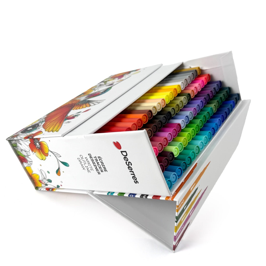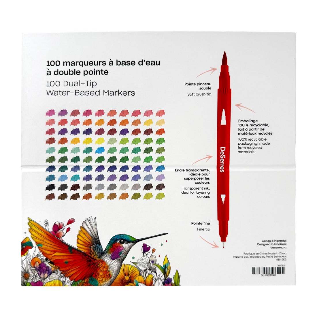 This set offers a wide range of 100 double-ended markers: a soft brush tip for fluid, expressive lines and a fine tip for precise details. Their water-based, transparent, low-odor ink is ideal for layering and creating watercolor effects when used with water.