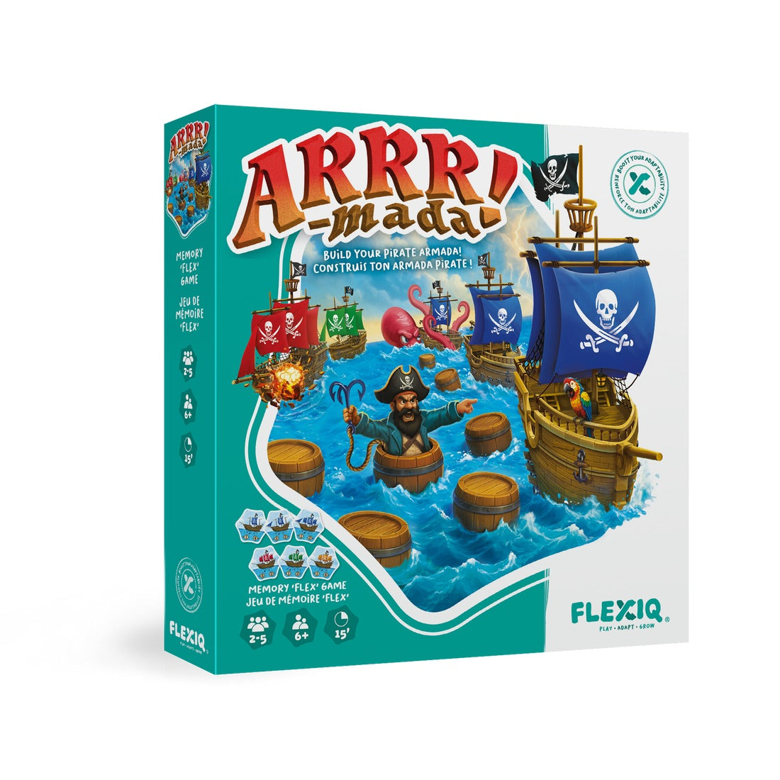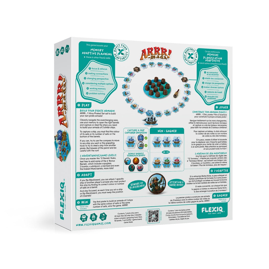 Skillfully navigate the changing seas, use your memory to open the right barrels, and capture or steal the ships you need to build your fleet. But watch out for Blackbeard, whirlpools, explosive barrels, and the Kraken! The first pirate to assemble an armada of three ships with the same color sails or the same number of sails wins the game!