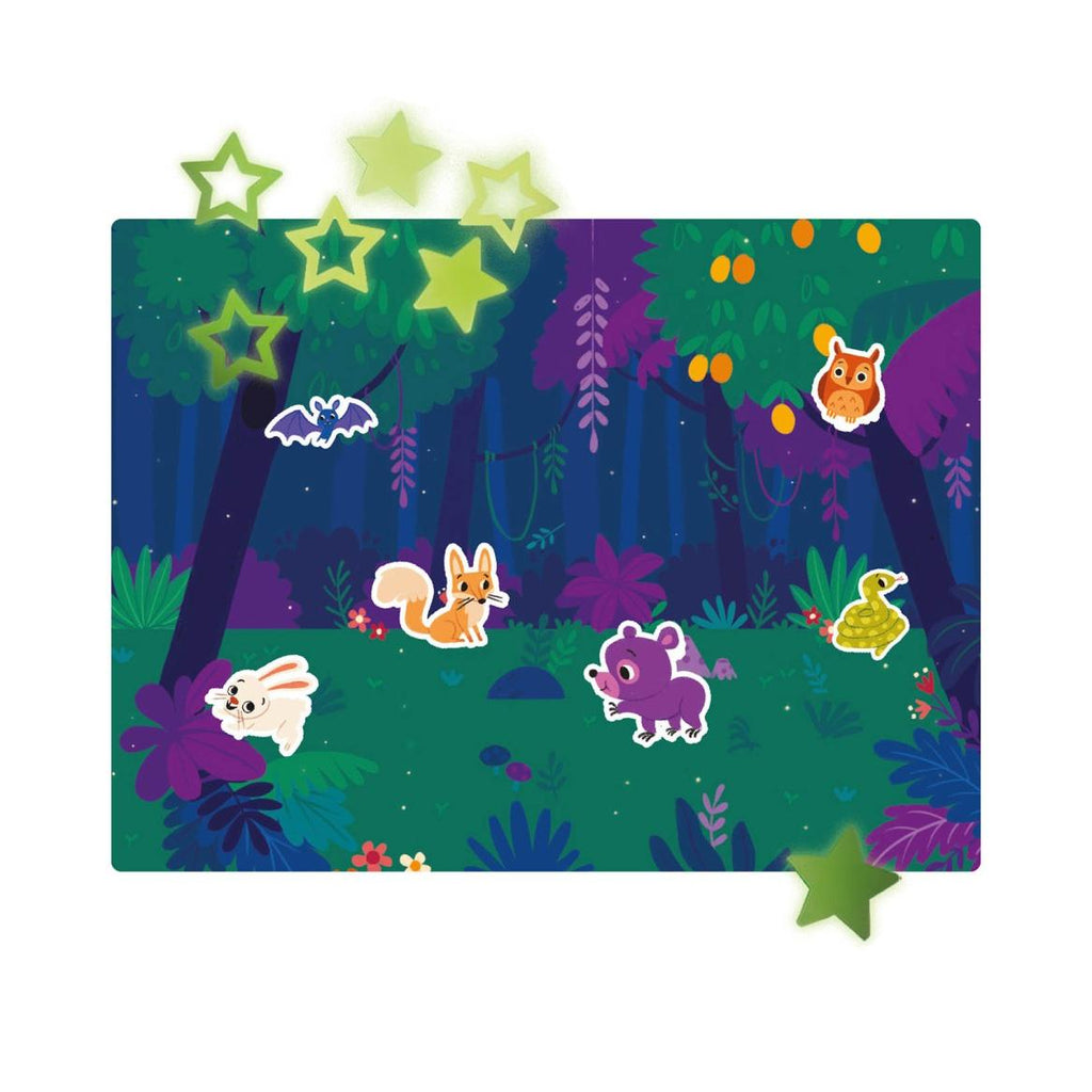 Discover a magnificent forest poster to decorate with 200 glow-in-the-dark stickers! 8 stars and moons to hang from the ceiling are also included!