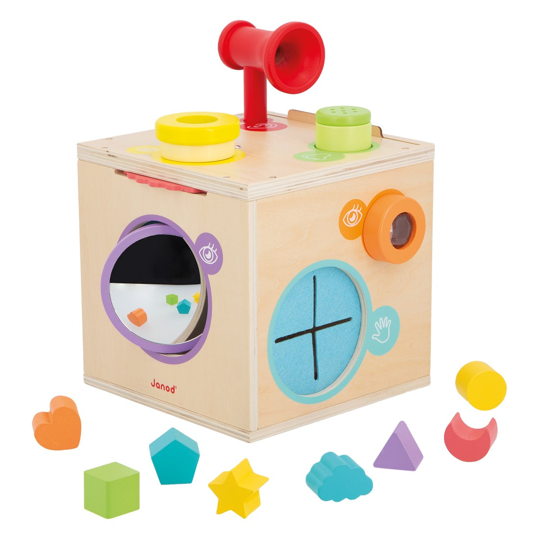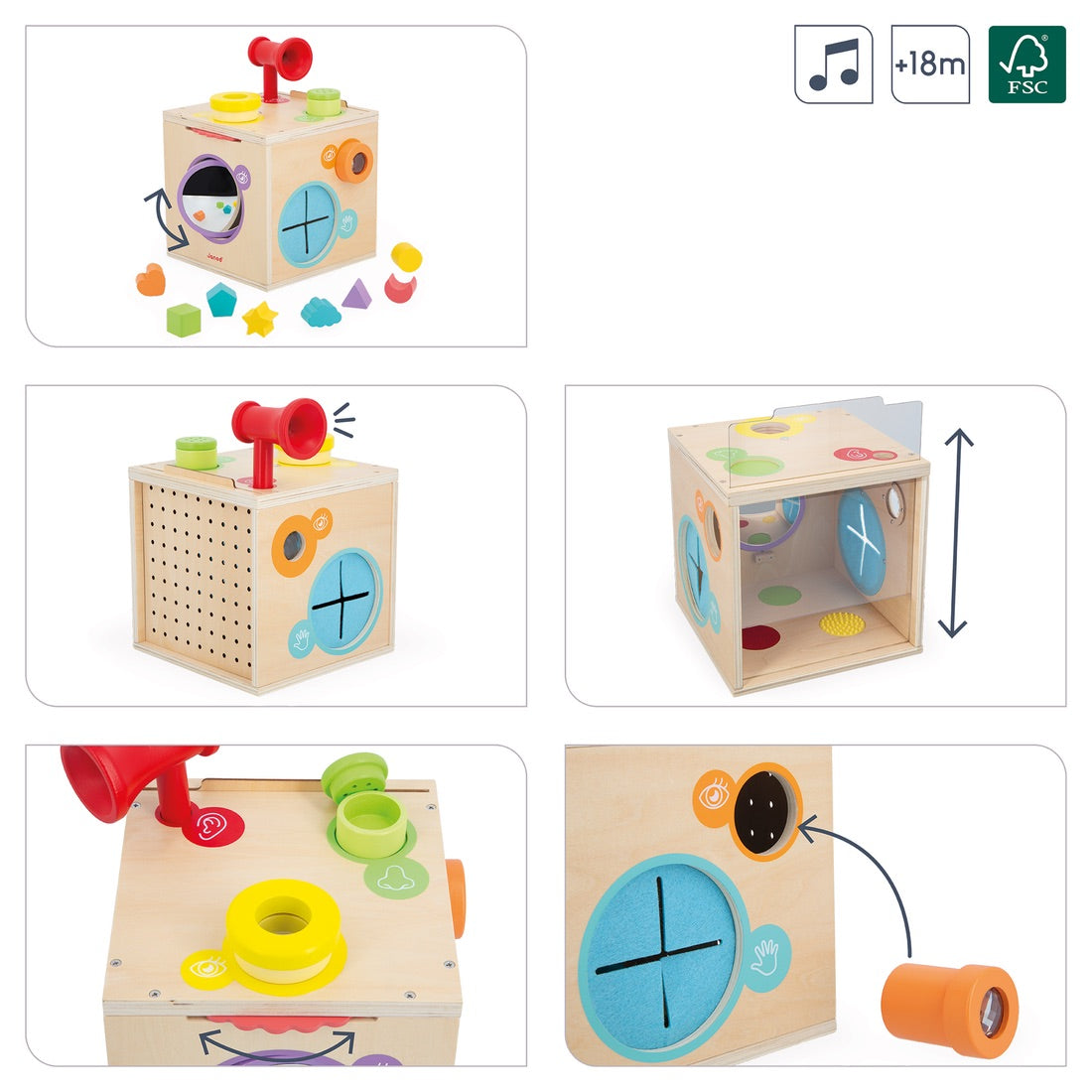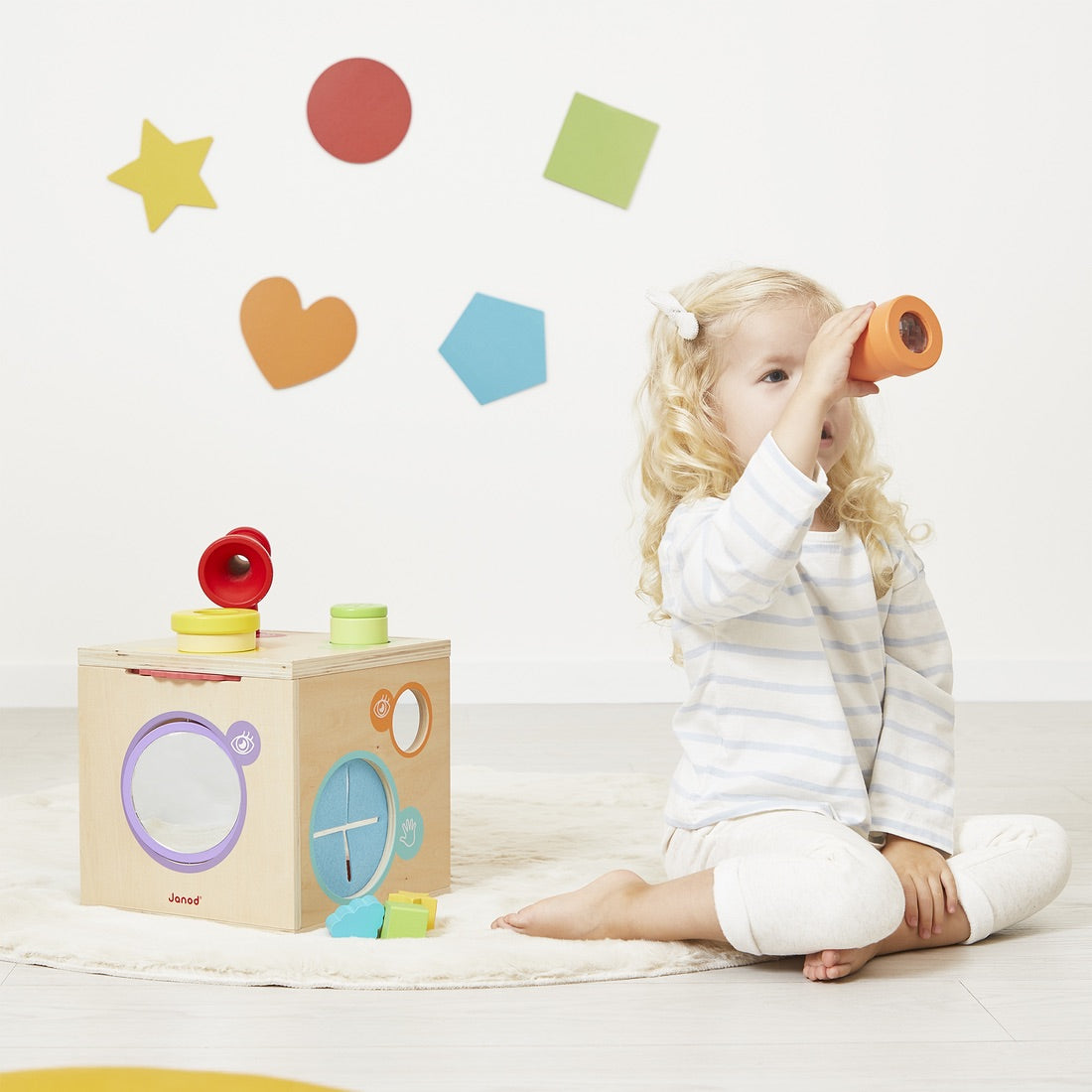 Awaken his sense of smell with aromatic herbs. Experiment with voice amplification with the megaphone. Touch to discover new textures or recognize simple shapes. Observe objects and the environment through kaleidoscopes or color filters. Play with light and mirrors. Many moments of fun and complicity await you!