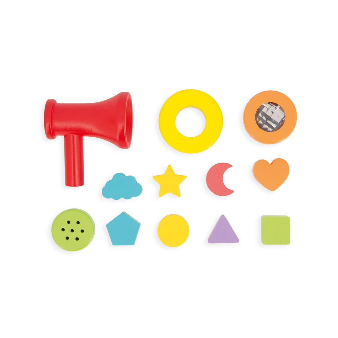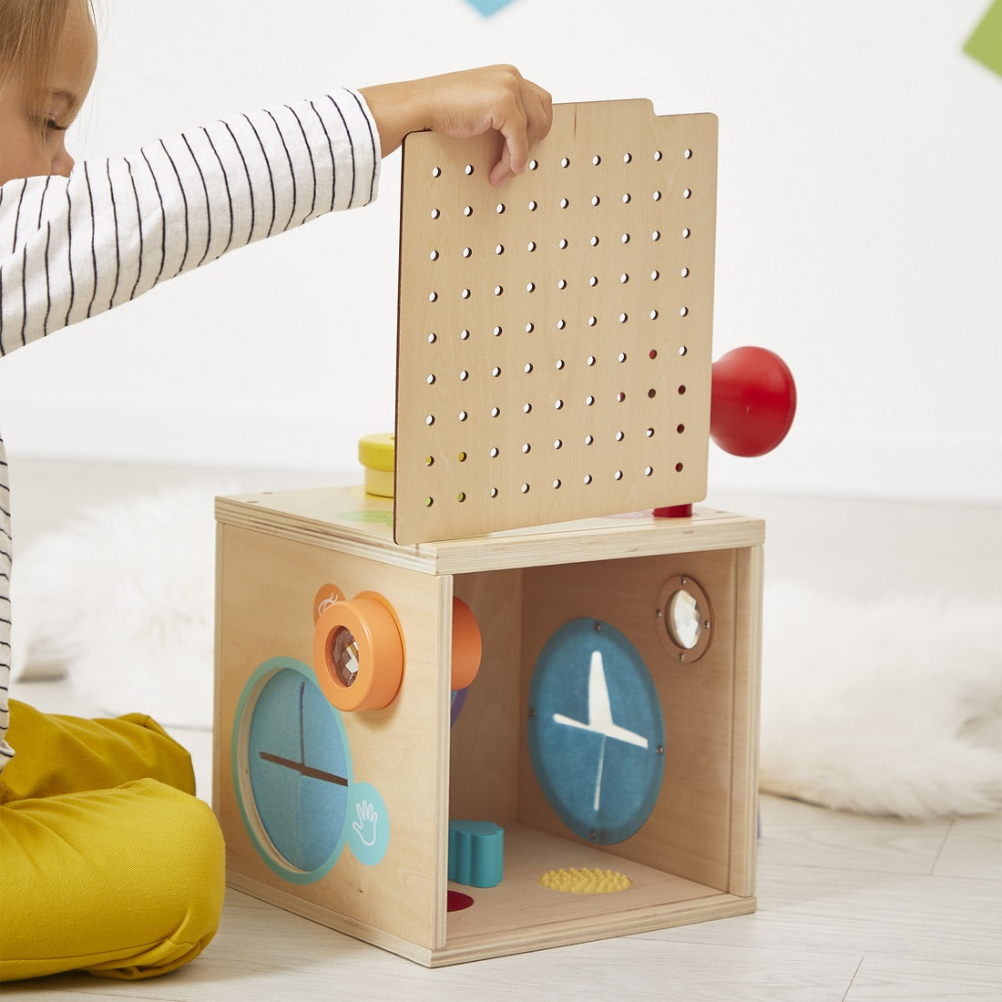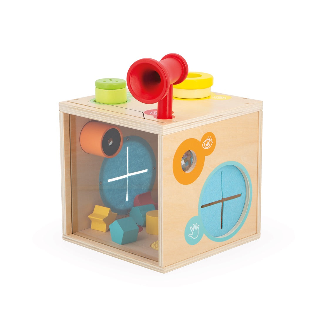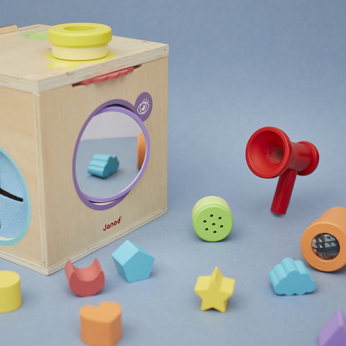 Awaken his sense of smell with aromatic herbs. Experiment with voice amplification with the megaphone. Touch to discover new textures or recognize simple shapes. Observe objects and the environment through kaleidoscopes or color filters. Play with light and mirrors. Many moments of fun and complicity await you!