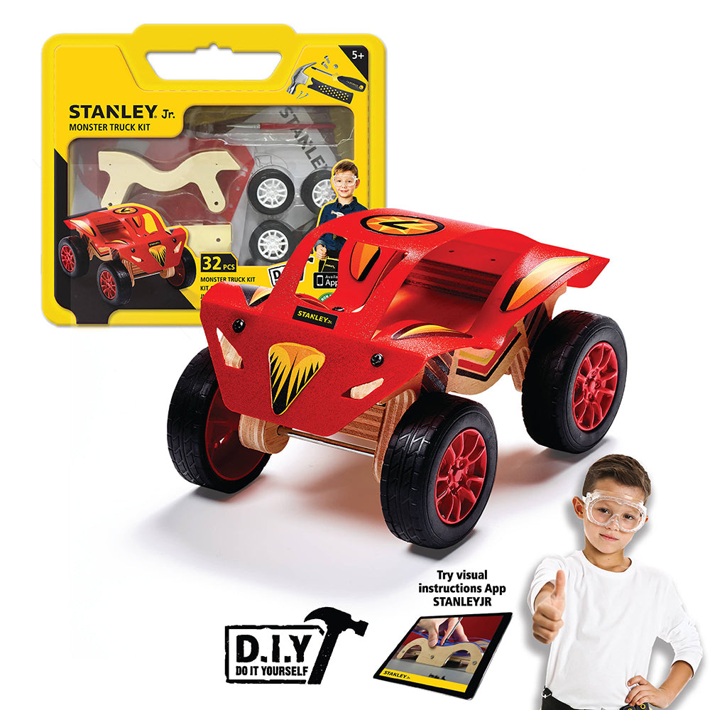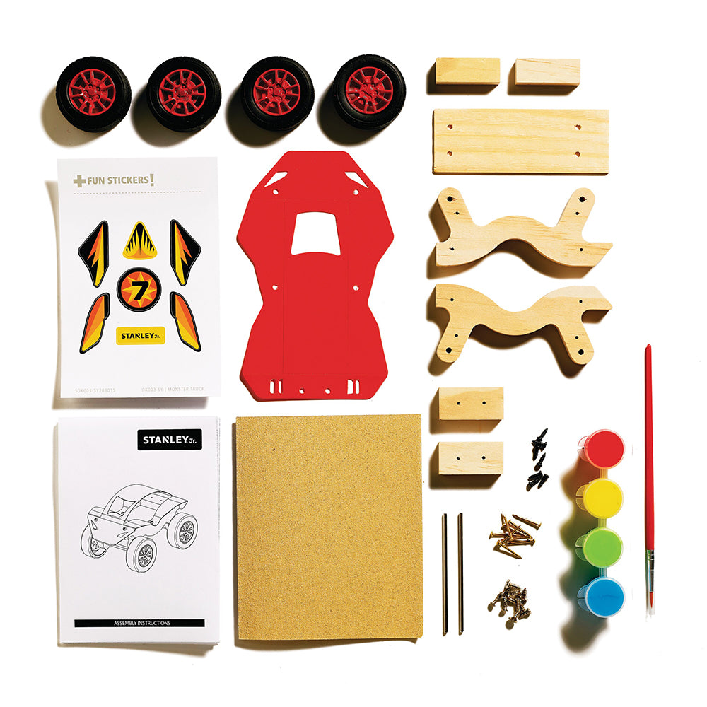 - Includes: pre-cut wooden parts, wheels, screws and nails, sandpaper, 4 paints, 1 brush, 1 sheet of stickers, instructions.
