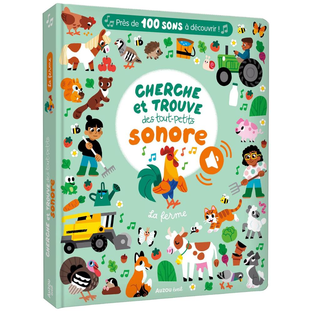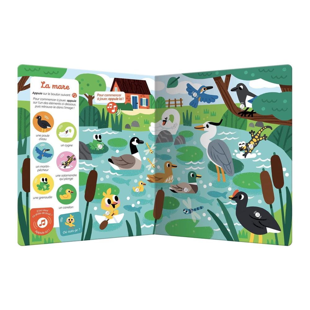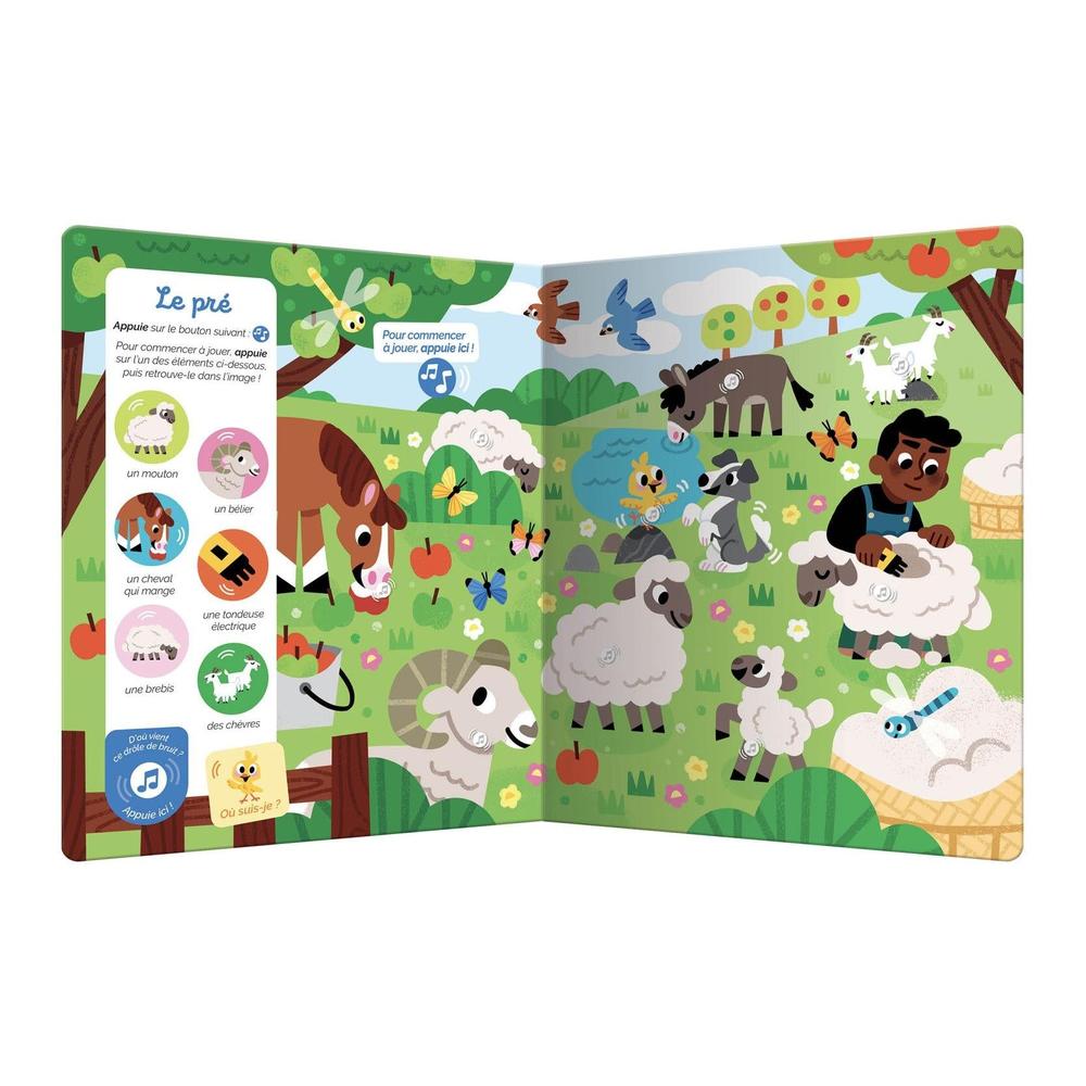 On each double-page spread, he observes and listens carefully to find 6 animals and a mascot hiding in each world: the barnyard, the stable, the meadow... A random game mode is available on each board: find the animal or element that corresponds to the sound you hear!