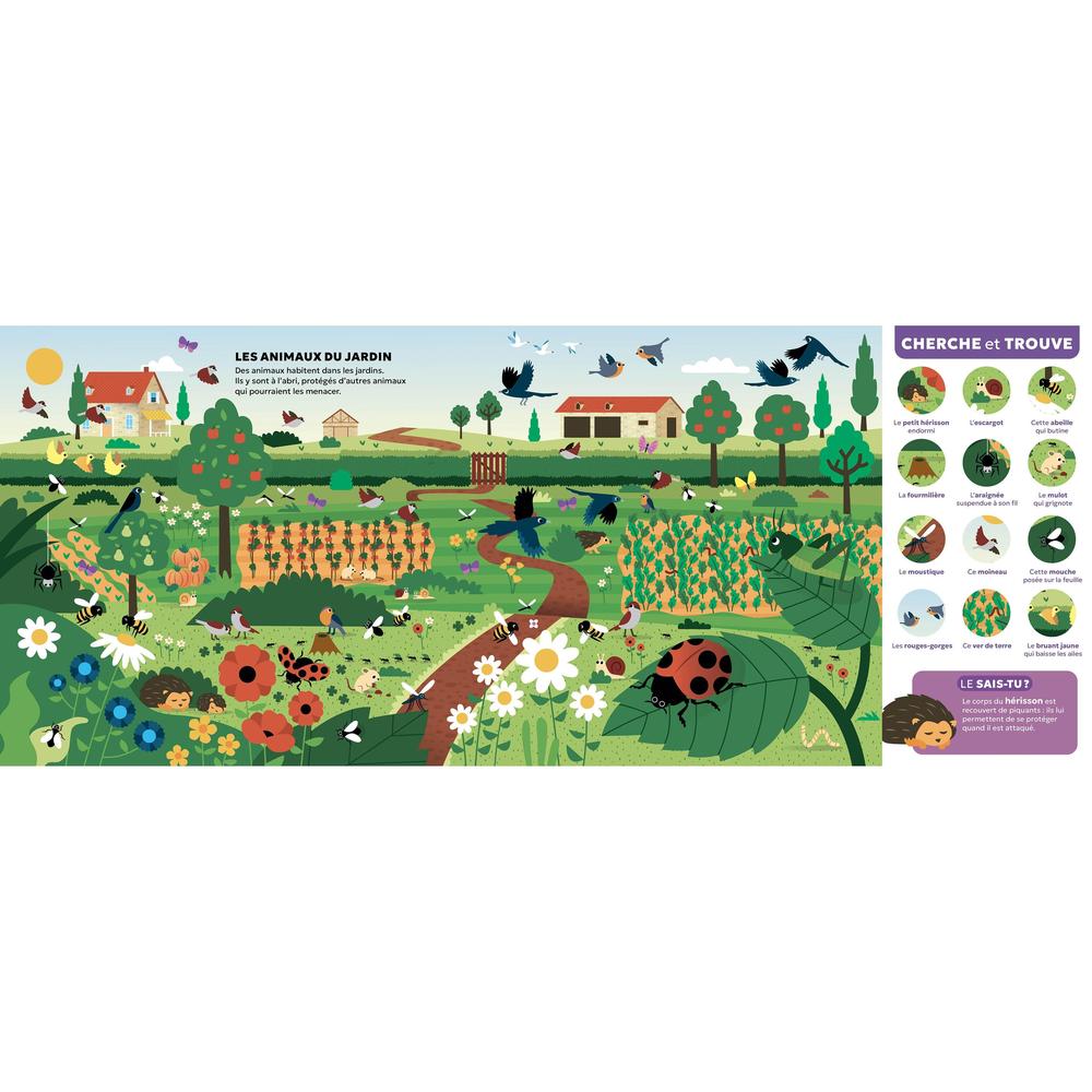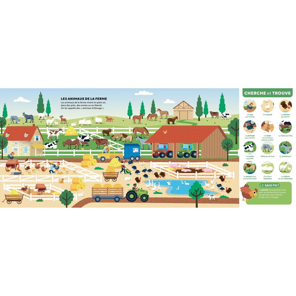 9 large search-and-find boards on the theme of animals (farm, forest, sea, savannah...), related documentary information on the large flaps, and 2 double-page documentaries at the end for those who want to know even more!