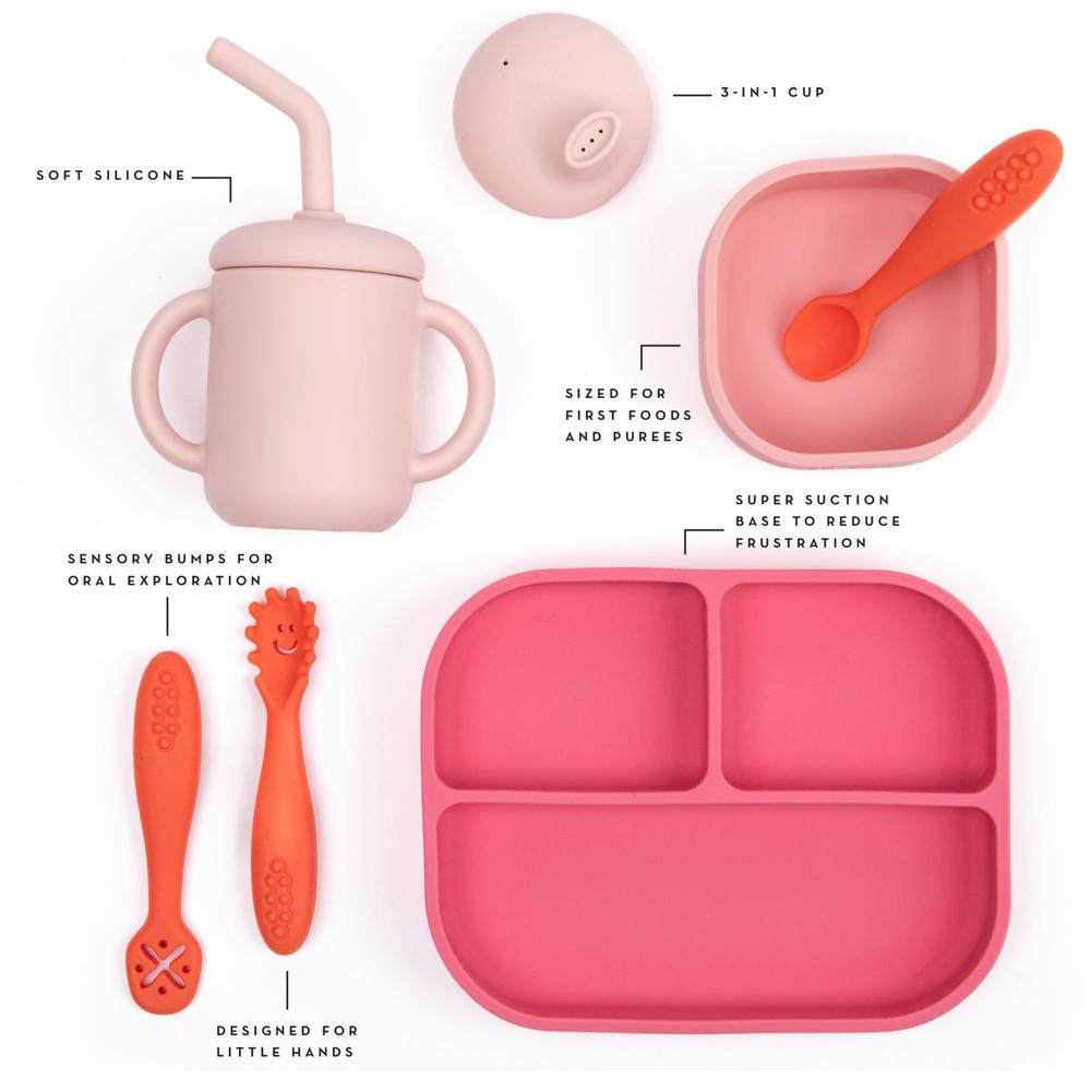 This set is the ideal birth gift and a must-have for parents. One set includes everything you need: you'll receive a cup, 2 lids, 3 utensils, 1 suction plate and 1 starter bowl.