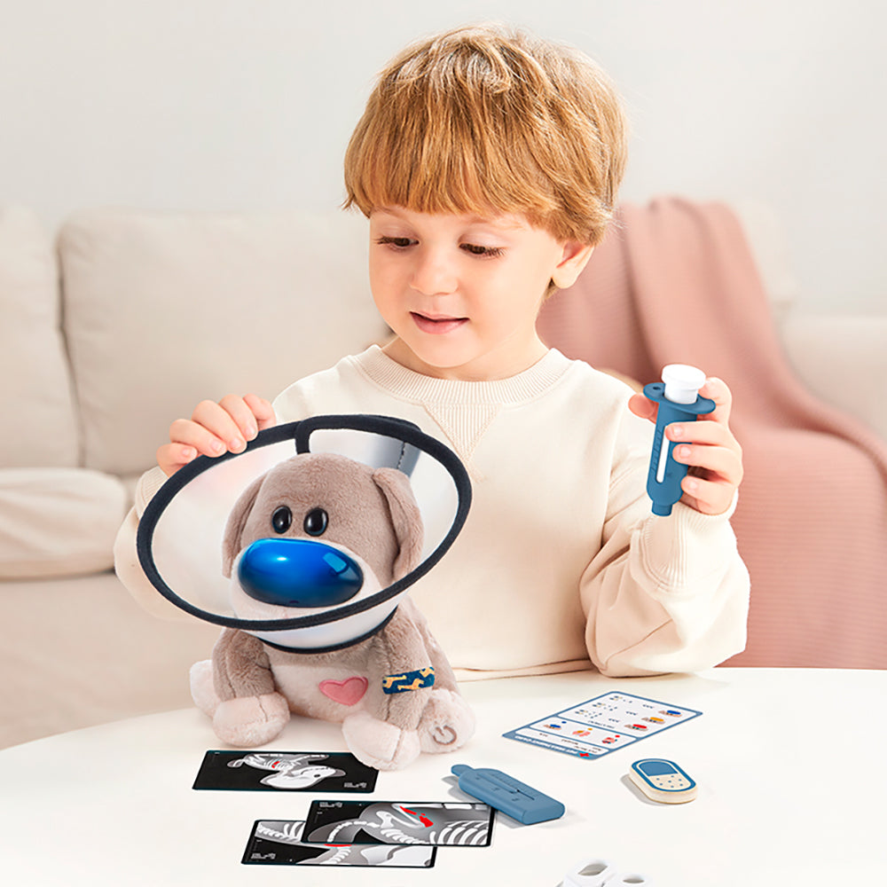 An adorable interactive plush puppy with lights and sounds that "gets sick"! Children diagnose and treat their furry friend with a stethoscope, syringe and thermometer. The colorful diagnostic card teaches logic and empathy by matching symptoms to treatments. Perfect for developing curiosity, problem-solving skills and fun role-playing.
