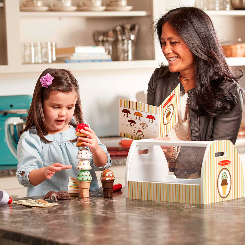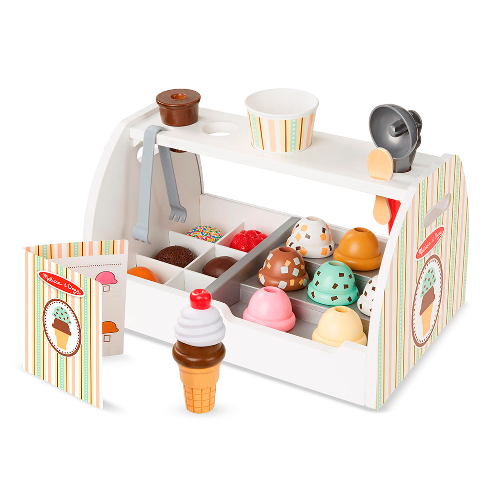 - Includes wooden ice cream counter, eight ice cream scoops, six toppings, two cones, one cup, one ice cream scoop, one pair of tongs, one wooden spoon and six $1 bills.