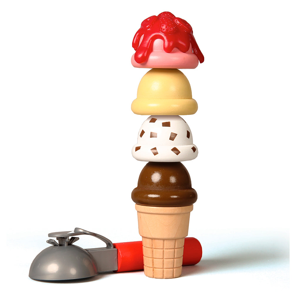 The sturdy wooden counter contains eight wooden ice cream scoops in different flavors, six assorted toppings, two cones, a plastic cup, an ice cream spoon, a wooden spoon, tongs, a reusable menu card and six dummy banknotes.