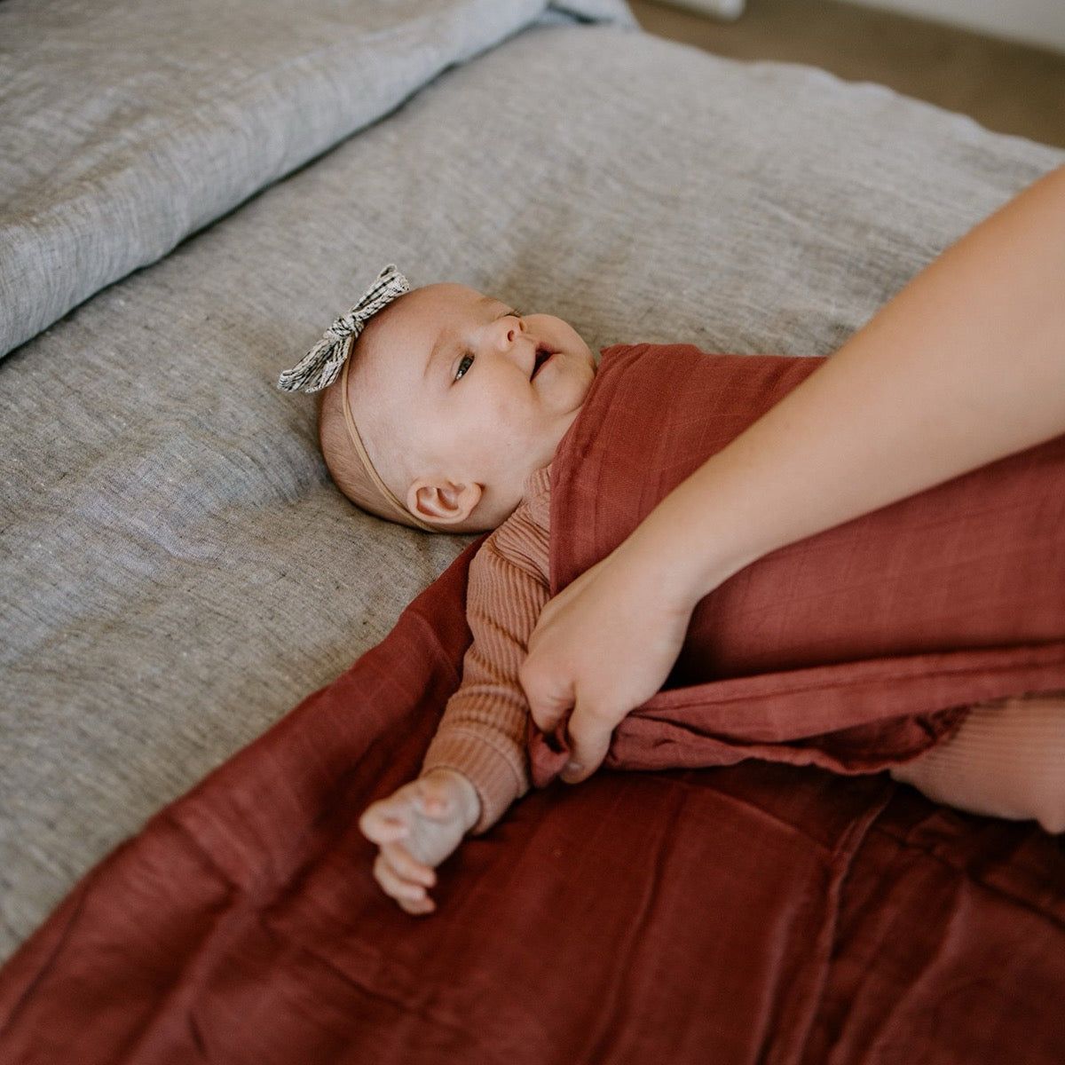 Our everyday swaddle is adorned with incomparable softness: ultra-soft to the touch and extremely gentle on baby's delicate skin. Adorned with our signature hand-painted prints, it's a refined essential for swaddling, nursing, cuddling and so much more.