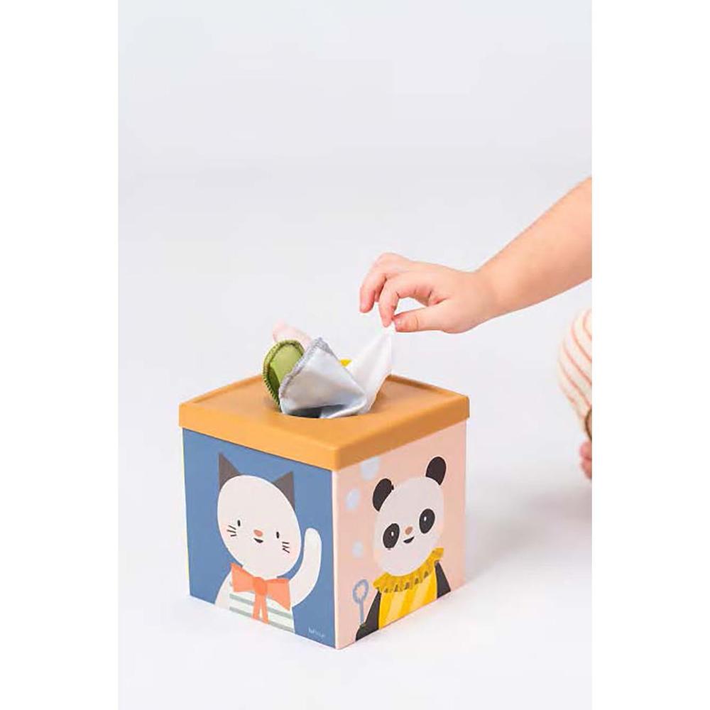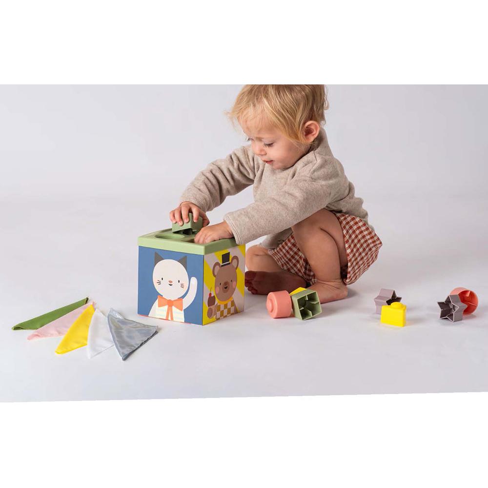 With its 5 colorful cloths, 3 play balls and 8 stackable shapes, this cube encourages cognitive growth and the development of motor skills through interactive play.