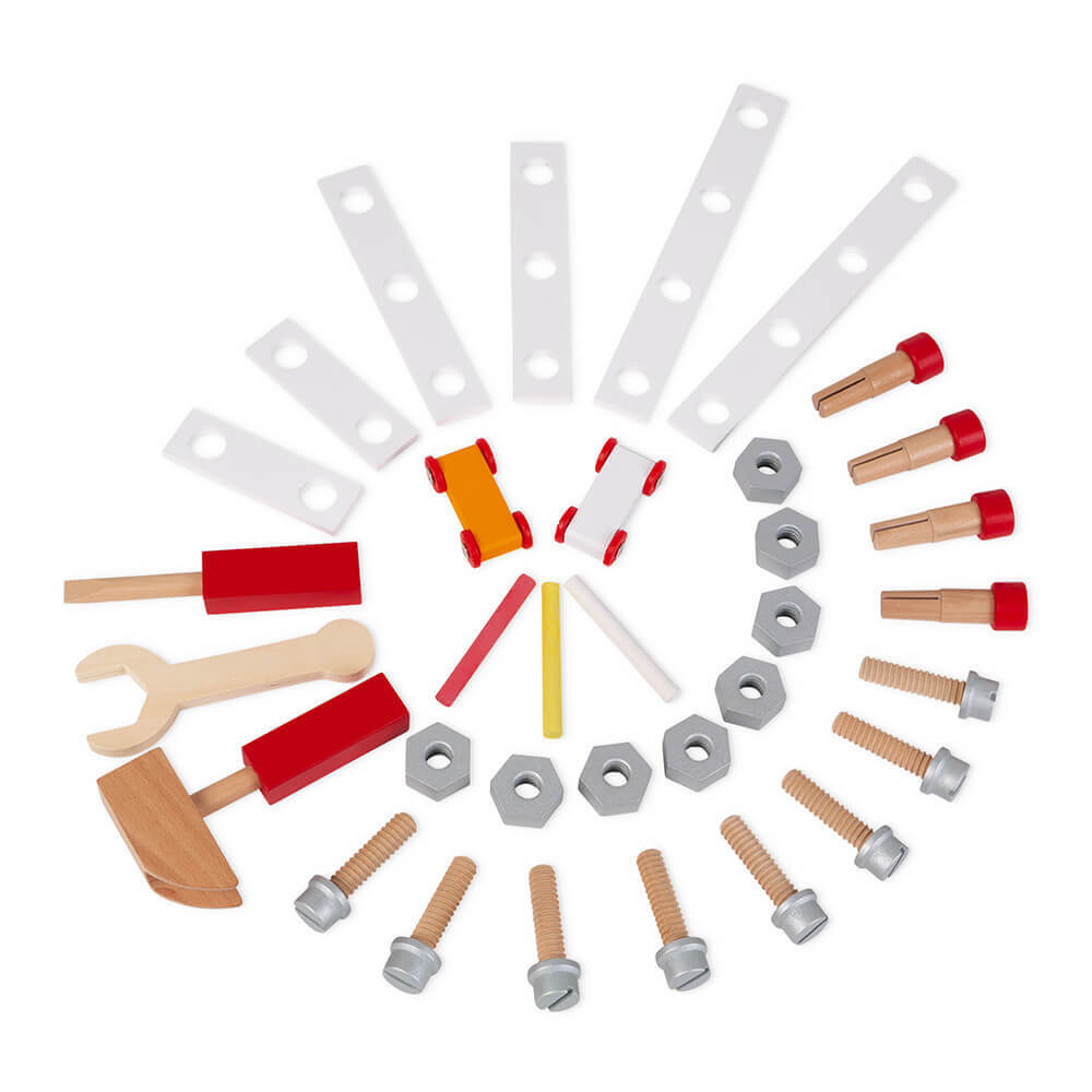 Ideal for children from 3 to 8 years old, this magnificent wooden workbench is as beautiful as it is complete! Made of curved wood, it is very original and can be played on both sides: On the front side, there is a complete magnetic workbench, with a clever system of magnetic tools so that the material is always stored in the right place and many accessories to invent objects to be assembled and disassembled endlessly. Also included are 3 magnetic tools, 29 accessories (nuts, screws, wooden nails, plates, chalk ...), a vice, a gear system and a slate (on the side) to write with chalk.