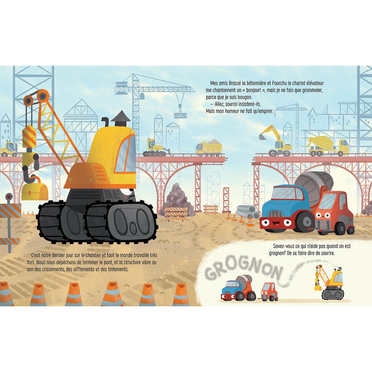 It's the last day on the job, and Grumpy the Crane is feeling, well, grumpy. And he doesn't want to talk about it. His friends Brassé the concrete mixer, Fourchu the forklift and Ben the truck try to cheer him up. But you know what doesn't help when you're feeling grumpy? A lot of talking.