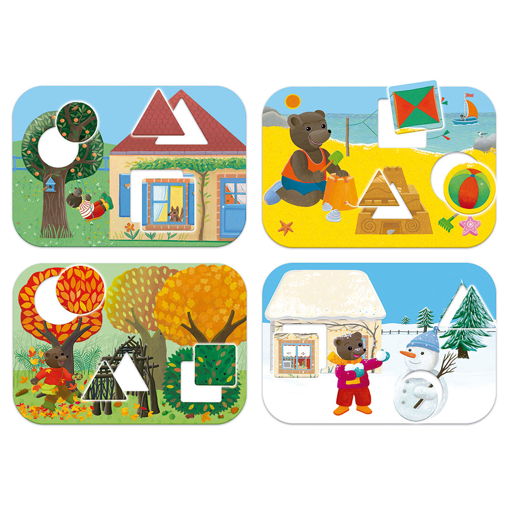 The game for learning geometric shapes with the LITTLE BROWN BEAR. Compare shapes and sizes and learn to identify and differentiate between the simplest geometric shapes: square, triangle, circle.