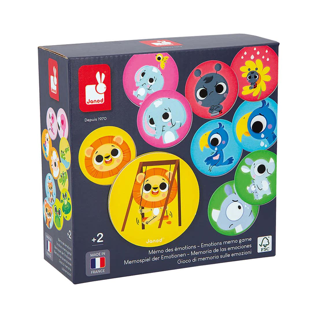 This colorful memo game is a fun way for children aged 2 and over to learn about emotions. Each token shows an emotion in close-up and in action, featuring charming animals.
