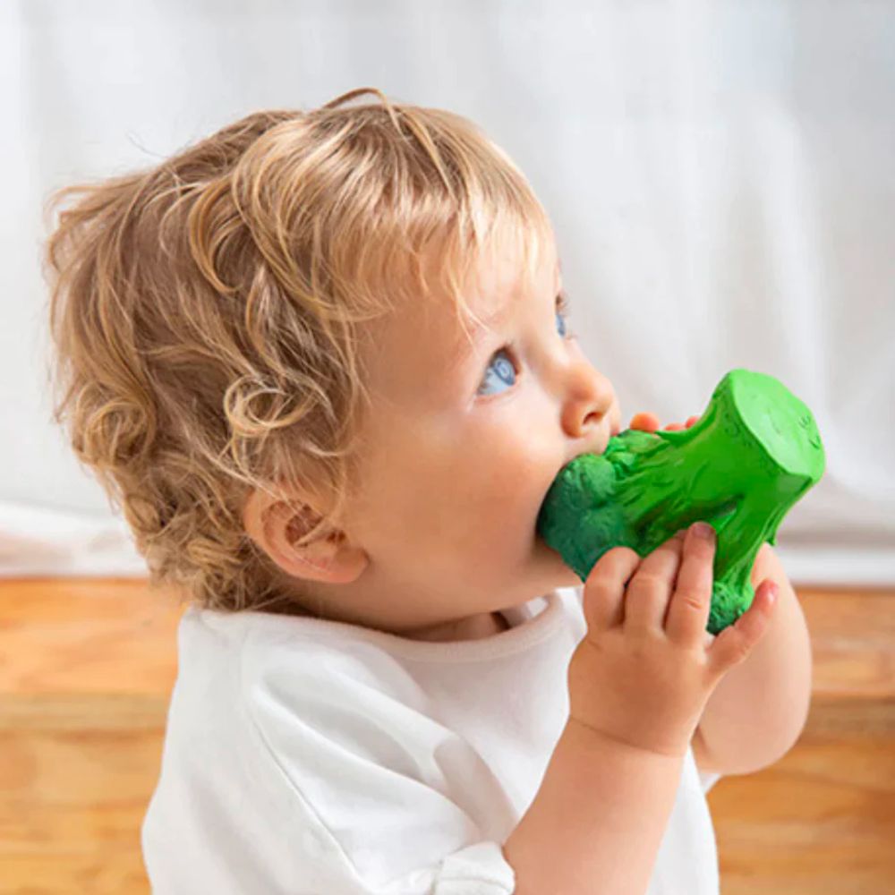 BRUCY LE BROCOLI is a vegetable-shaped chew toy that's soft and easy to hold in baby's hands. It's the ideal natural toy for sensory play, teething and bath time.