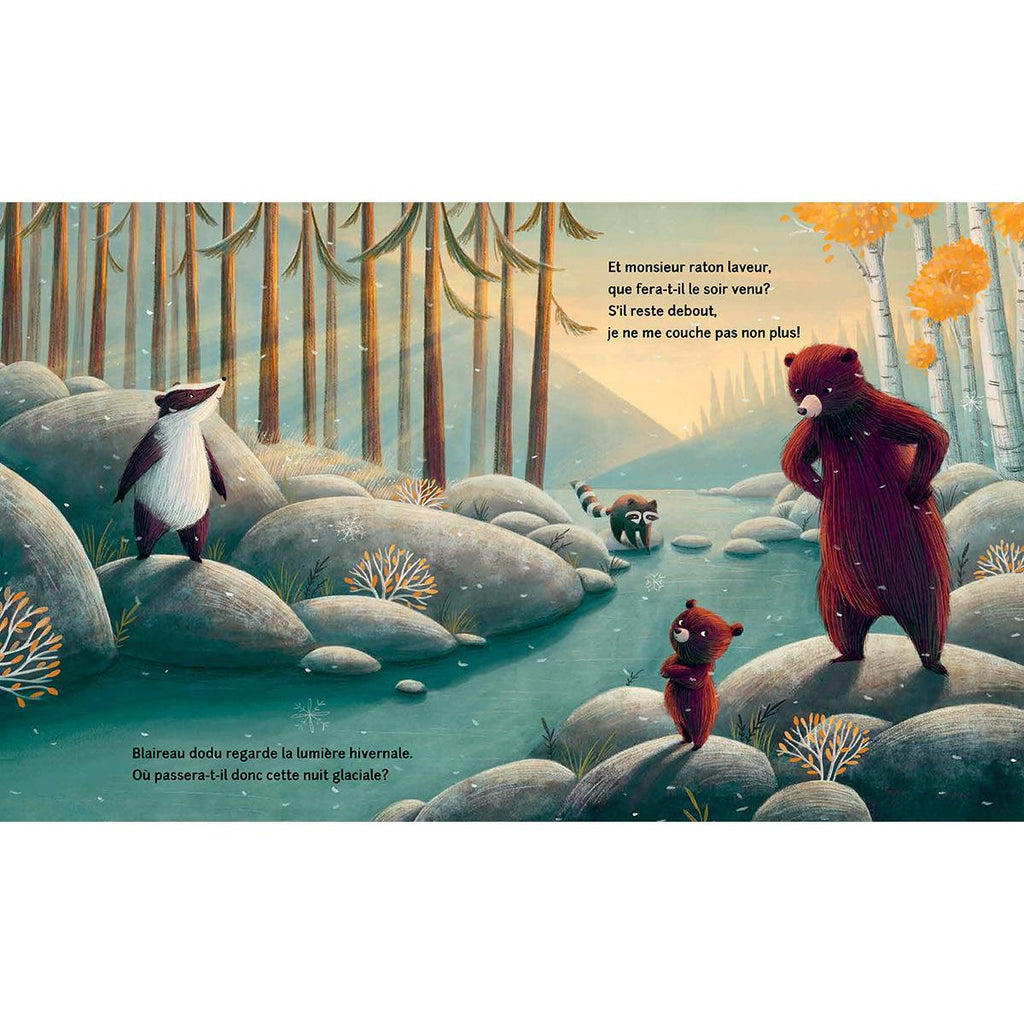 The cold wind begins to blow across the gray sky: it's time for Little Bear to go to bed. But how can he fall asleep when his forest friends, the mouse, the skunk and the badger, are walking nearby? Mummy Bear explains to Little Bear that they, too, will soon be retreating into the hollow of a log, a nest or a burrow to escape the winter cold. But Little Bear still won't go back to his den. Will Mama Bear be able to convince him?