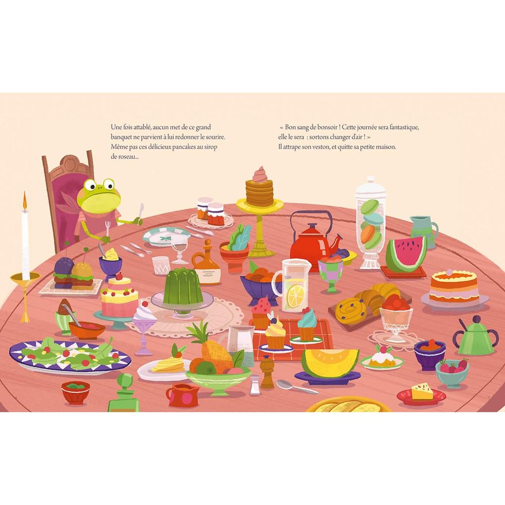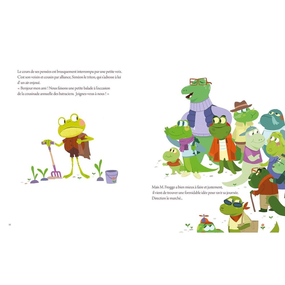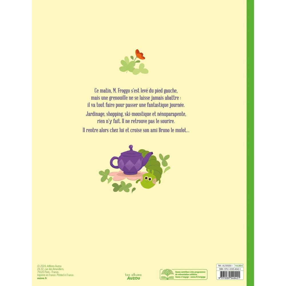 This morning, Mr Froggo woke up with his left foot, but a frog never lets himself down: he's going to do everything he can to have a great day. Gardening, shopping, mosquito-skiing and paragliding are all part of the plan. He just can't get the smile back on his face. So he goes home and runs into his friend Bruno, the field mouse...