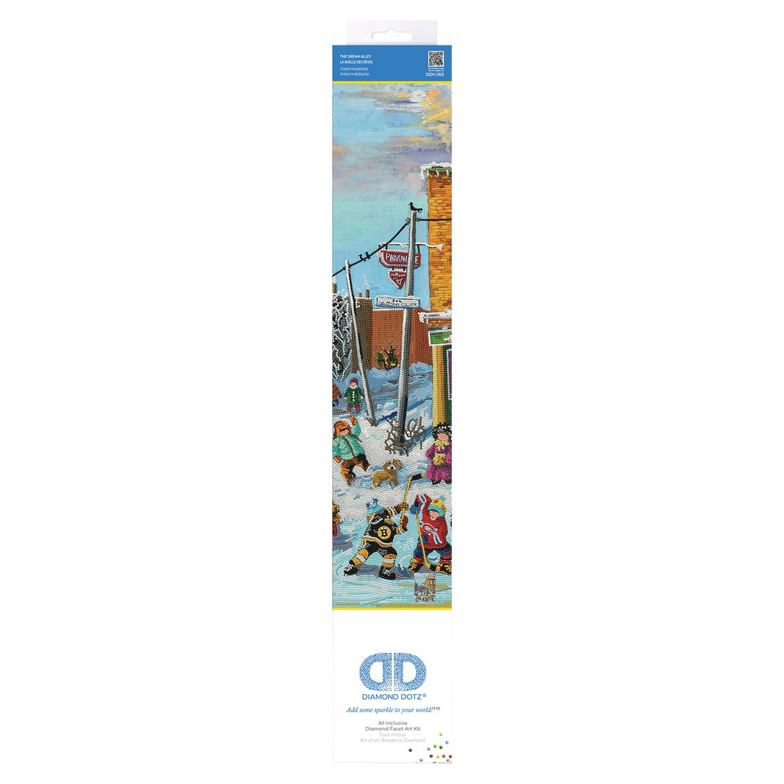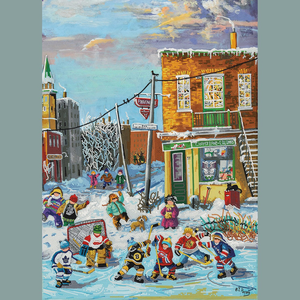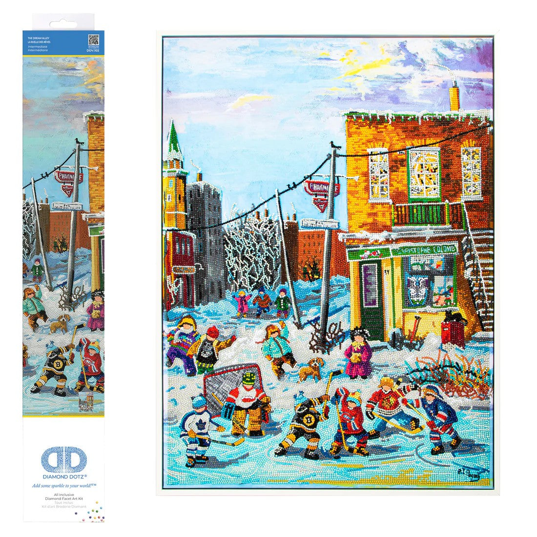 The Diamond Dotz embroidery kit is an invitation to create a scene full of charm and poetry. Inspired by Quebec artist Pauline Paquin, this 28" x 20" (71 cm x 51 cm) piece captures an alleyway bustling with childlike characters.