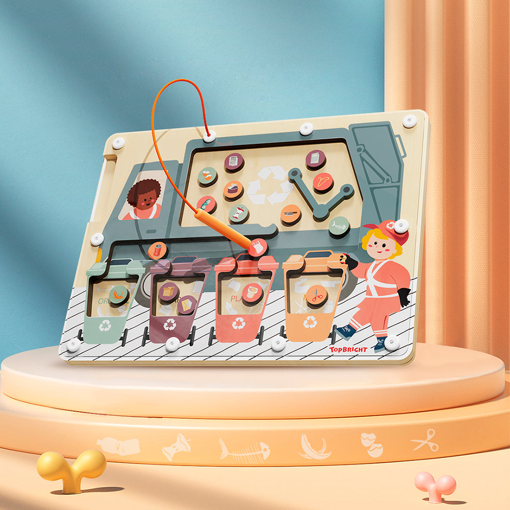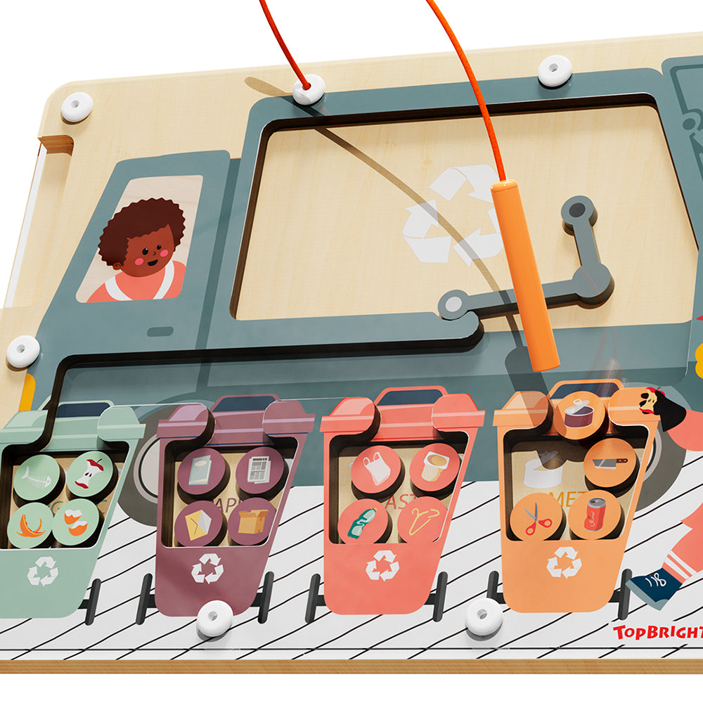 With the magnetic waste sorter, children can start learning the basics of recycling. Metal, paper, plastic or organic waste - children sort individual items into the right garbage can with the magnetic pen. In doing so, they learn about recycling and environmental protection. The magnetic maze also encourages them to discover colors in a playful way.