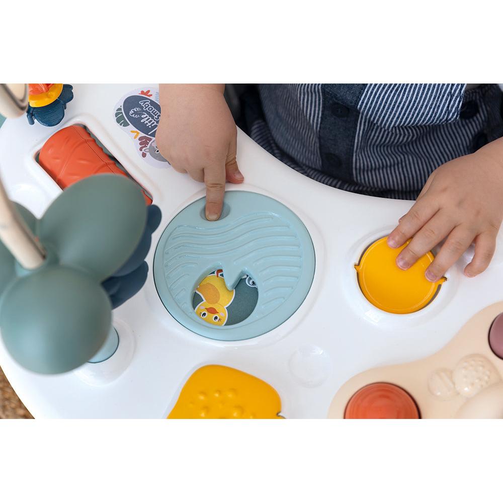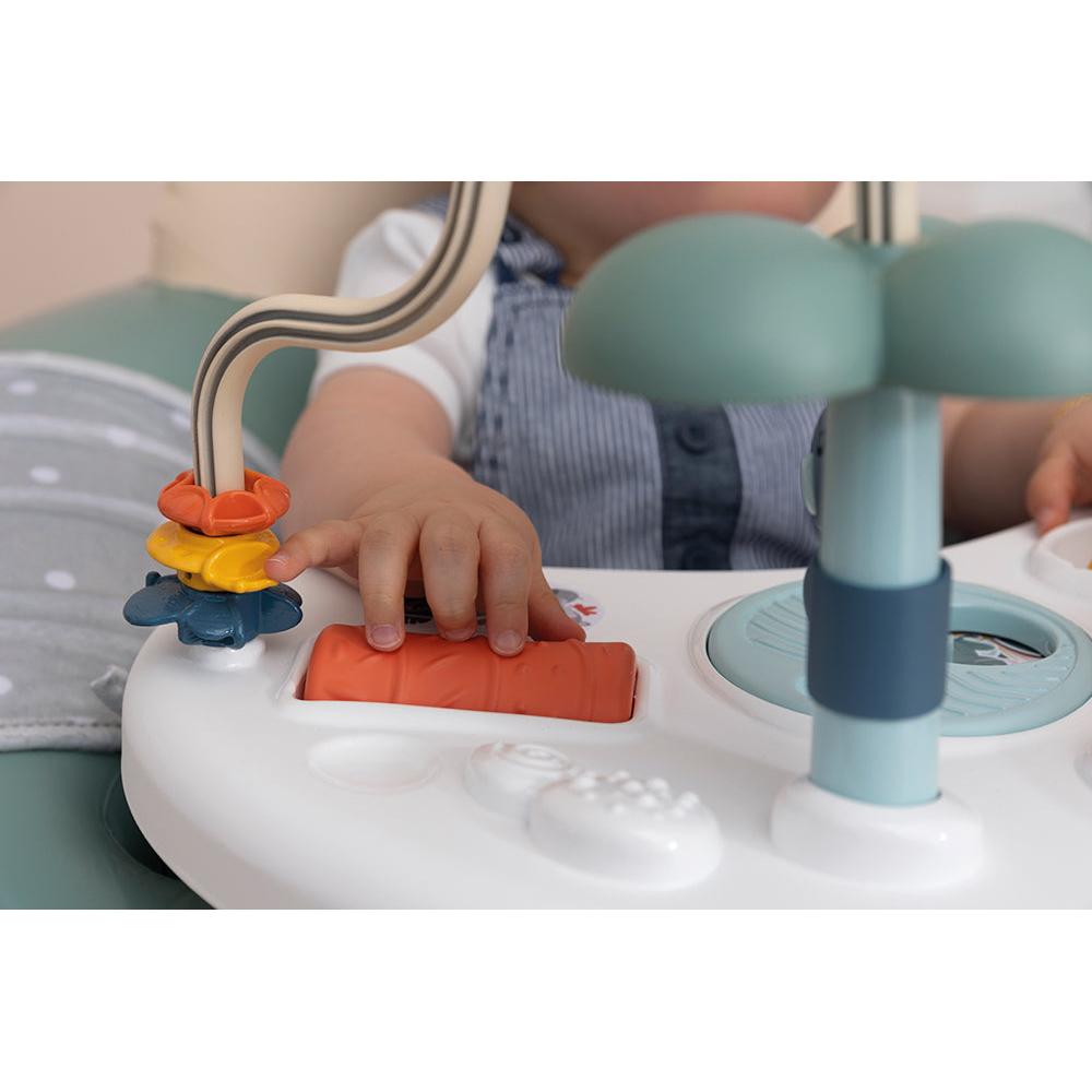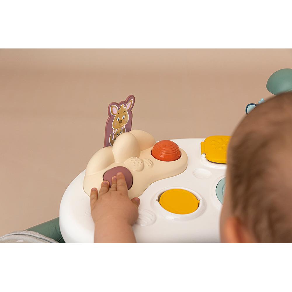 Extremely comfortable thanks to its polyester balls, the seat is combined with a table with a range of early-learning activities: the kangaroo with its baby playing hide-and-seek, the koala turning on its tree, a mirror, a sound pinet, an abacus or even the pond wheel for discovering different animals...