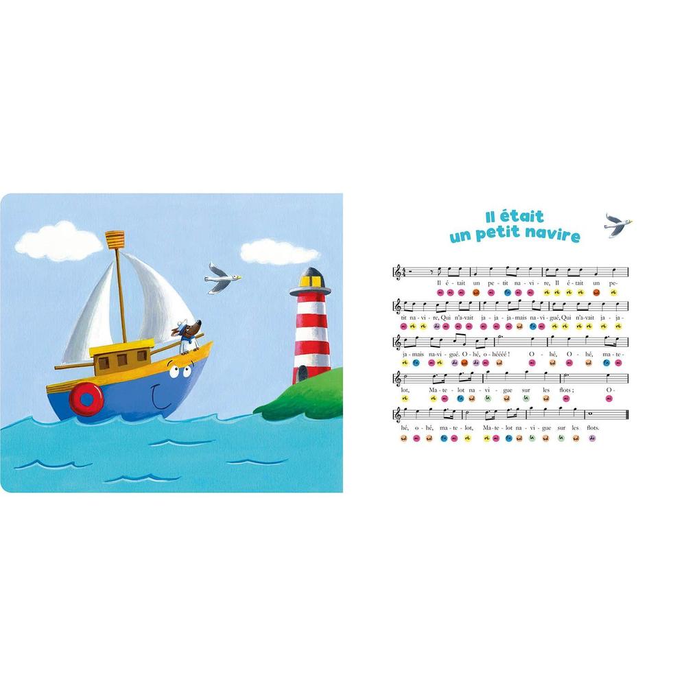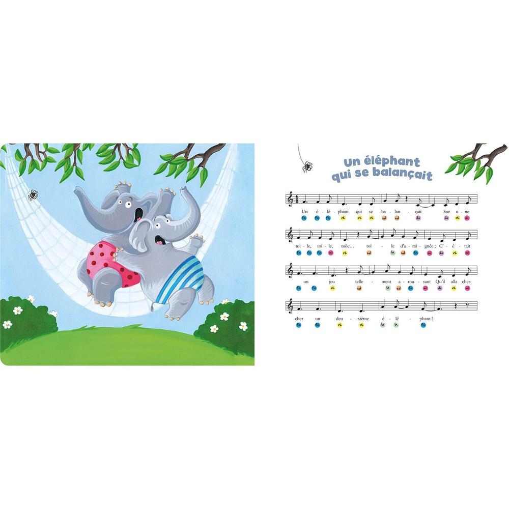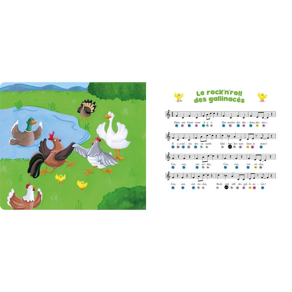 Featuring a built-in piano, the collection offers nursery rhymes suitable for toddlers! On the left-hand page, the text of the nursery rhyme accompanied by an illustration, and on the right-hand page, the musical stave with colored circles for easy play!