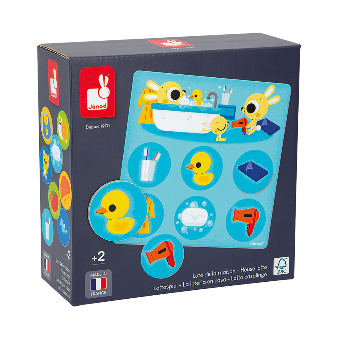 Embark on a fun learning adventure for toddlers with this lotto set featuring 4 boards and 24 tokens. From the age of 2, children can discover the world of pets, as well as the rooms of the house (kitchen, bedroom, bathroom and garden).
