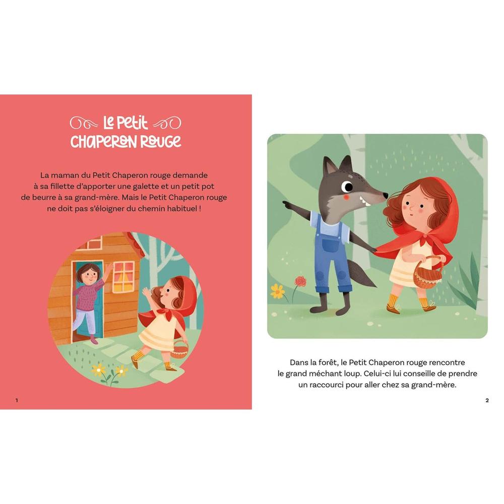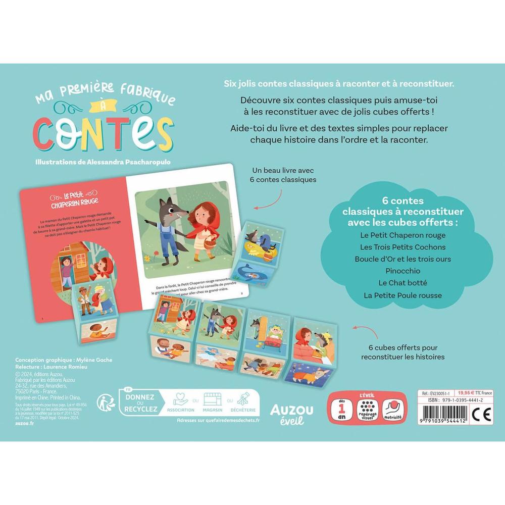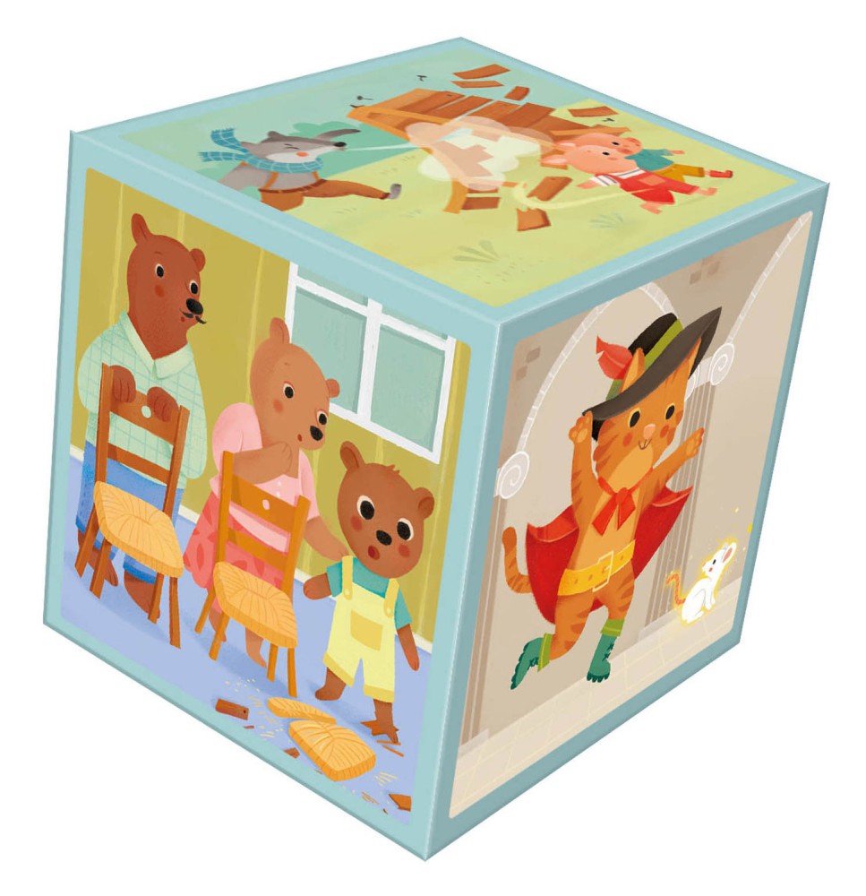 A box containing:- a book with 6 well-known tales- 6 illustrated cubes to reconstruct the stories.