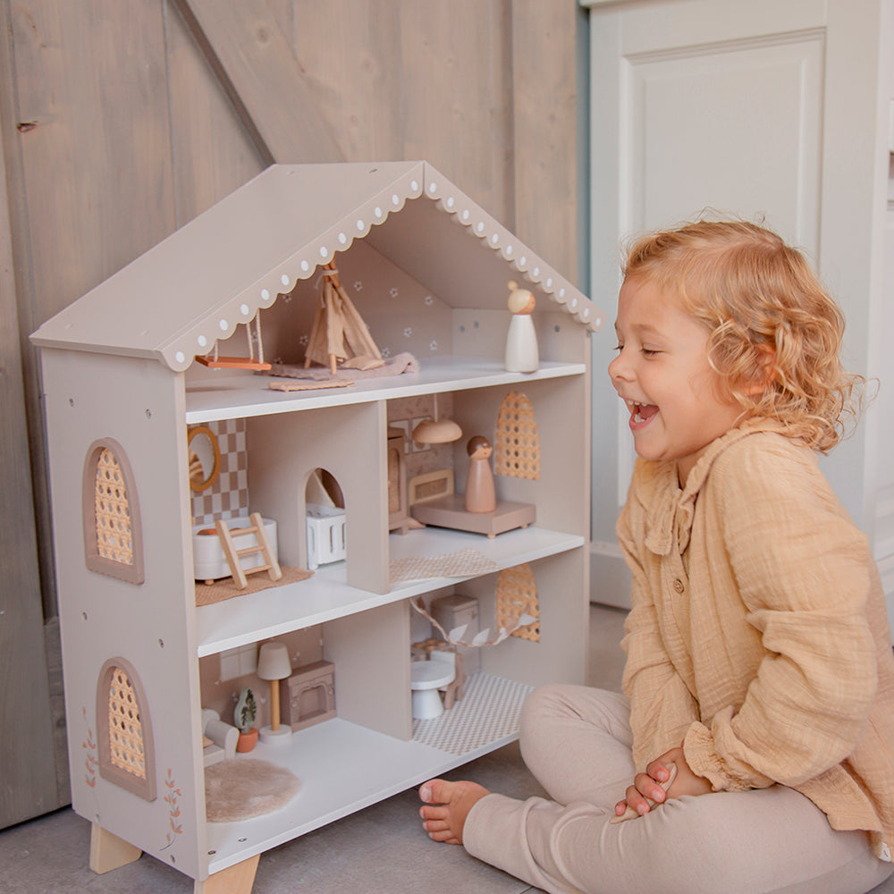 The dollhouse with all the essentials your child needs to create their own miniature world. It includes a wardrobe, bed, sofa, kitchen, table, chairs, bathtub, and even a vacuum cleaner and much more.