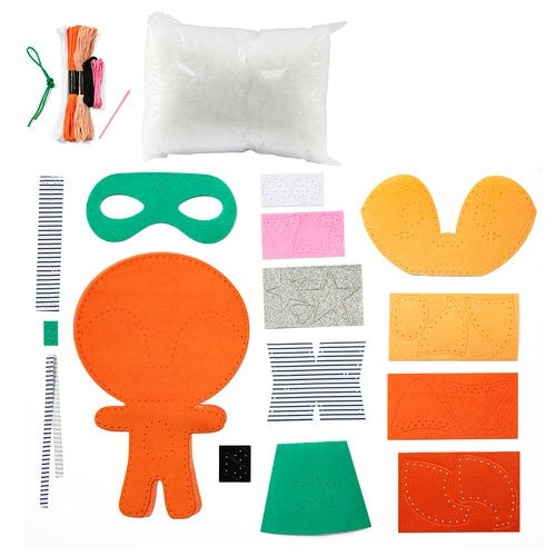 CONTENTS: felt elements (pre-punched or adhesive), wadding, plastic needle, threads, pre-punched fabric elements and instructions.