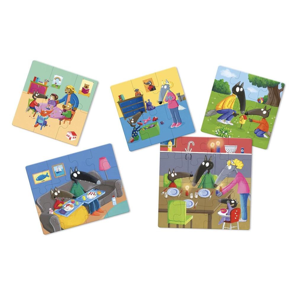 5 puzzles representing scenes from P'tit Loup's daily life: 2 "6 pieces" 1 "9 pieces" 1 "12 pieces" 1 "16 pieces".