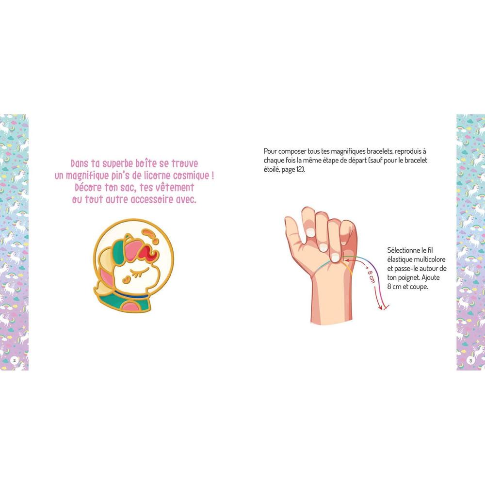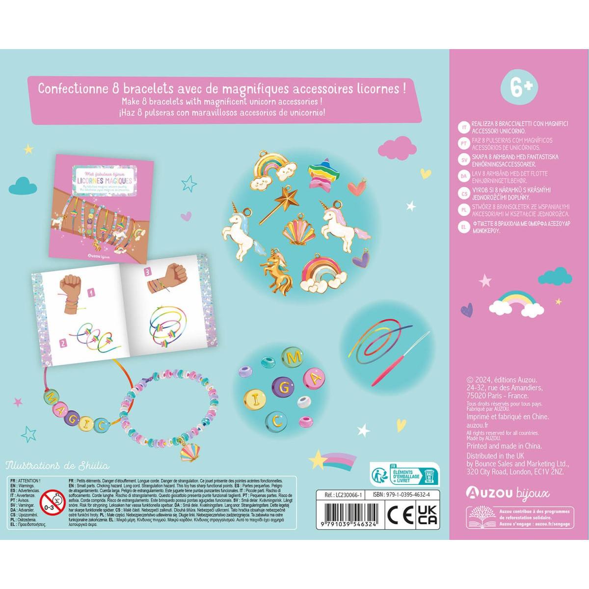 Rainbow, unicorn or magic wand charms... Make 8 beautiful unicorn-themed magic bracelets. This set also includes a cosmic unicorn pin to hang wherever you like!