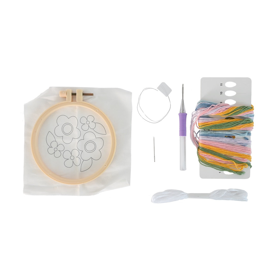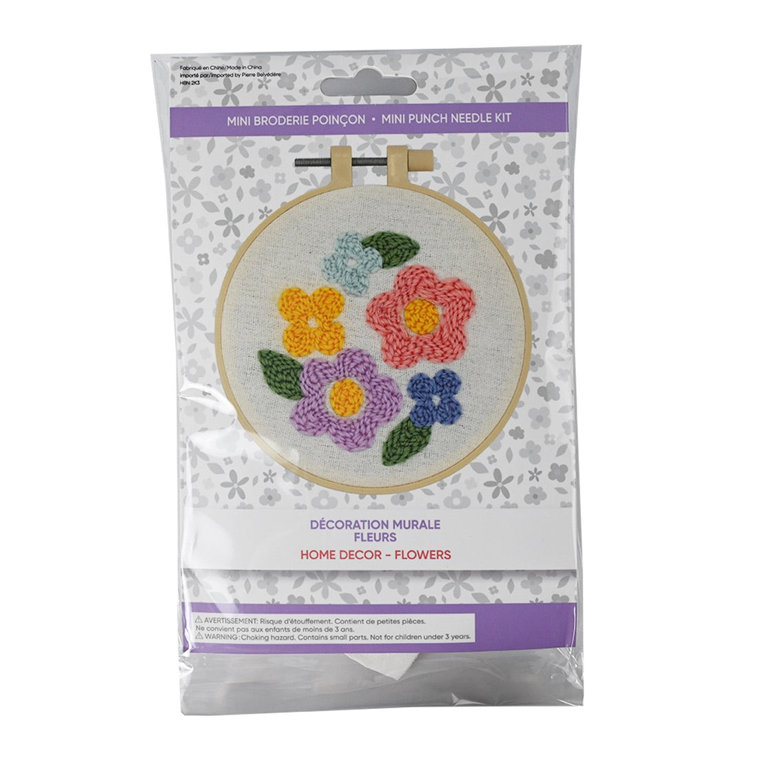 A miniature punch embroidery kit with a colorful floral motif. Ideal for a small decorative creation. All materials included.