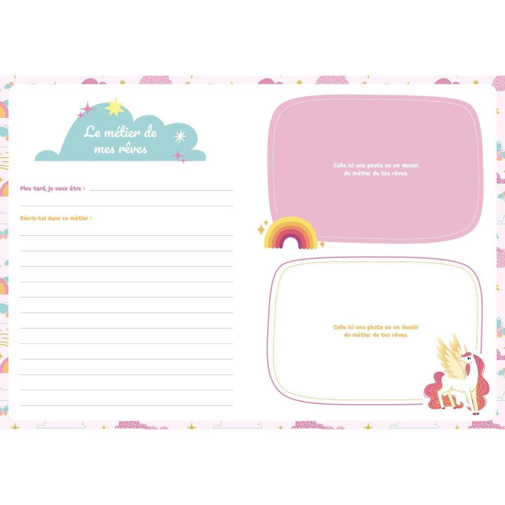 A trendy unicorn box! It contains a secret notebook with padlock, and pretty unicorn stationery: a pencil, an eraser, a unicorn paper clip, stickers, post-it notes, and pretty charms to make a bracelet on which to put the key to the notebook so you can always keep it with you.