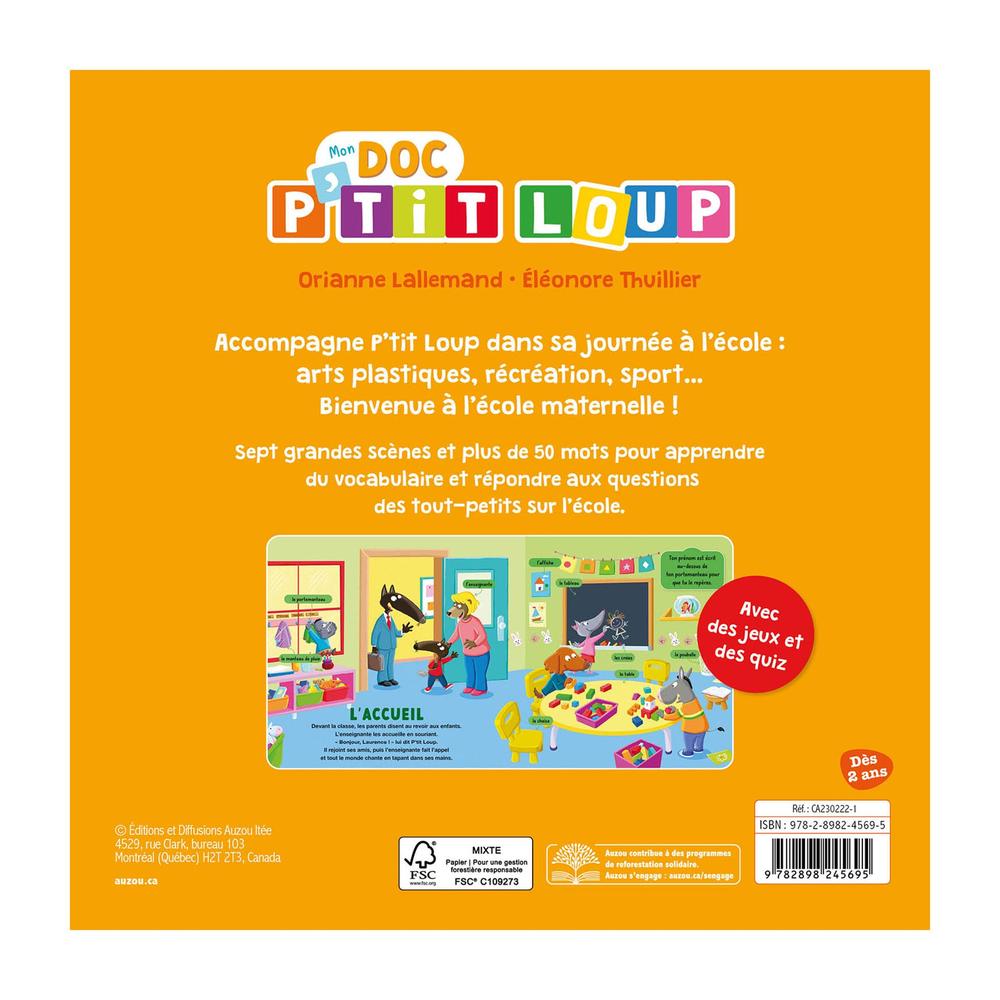 The first documentary collection for toddlers featuring P'tit Loup 'tit Loup: here, the reader follows P'tit Loup through his day at nursery school (welcome, activities, playtime, canteen...).