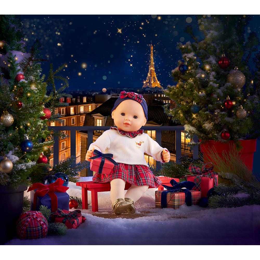 Suzanne Corolle en Fêtes is ready for the party with her ivory tartan collared sweater and matching skirt. Her sweater sparkles with a little dachshund in a tartan coat. She's also wearing tights, gold babies and a navy blue headband with a bow, for a cute, festive look!