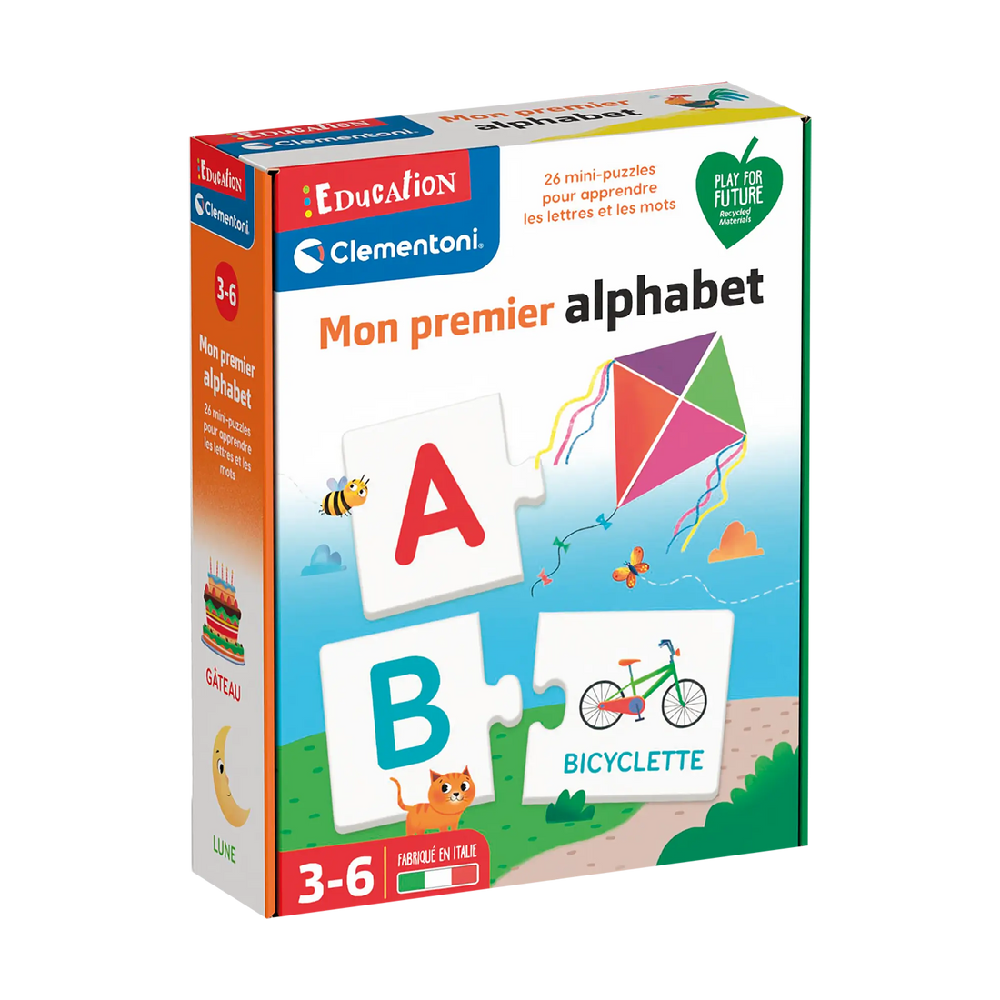 Box contents: 26 double-sided pieces to assemble with letters, pictures and words, 1 guide with play suggestions.