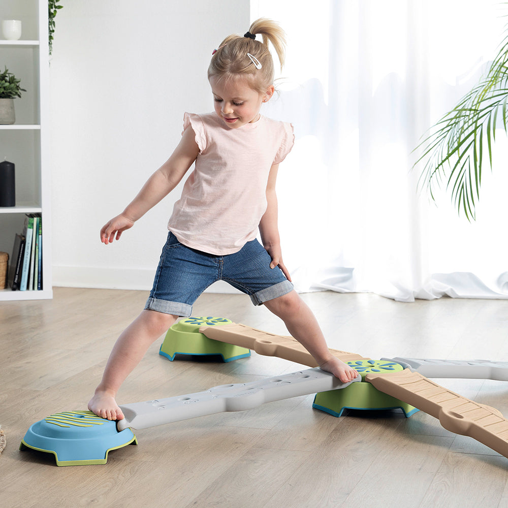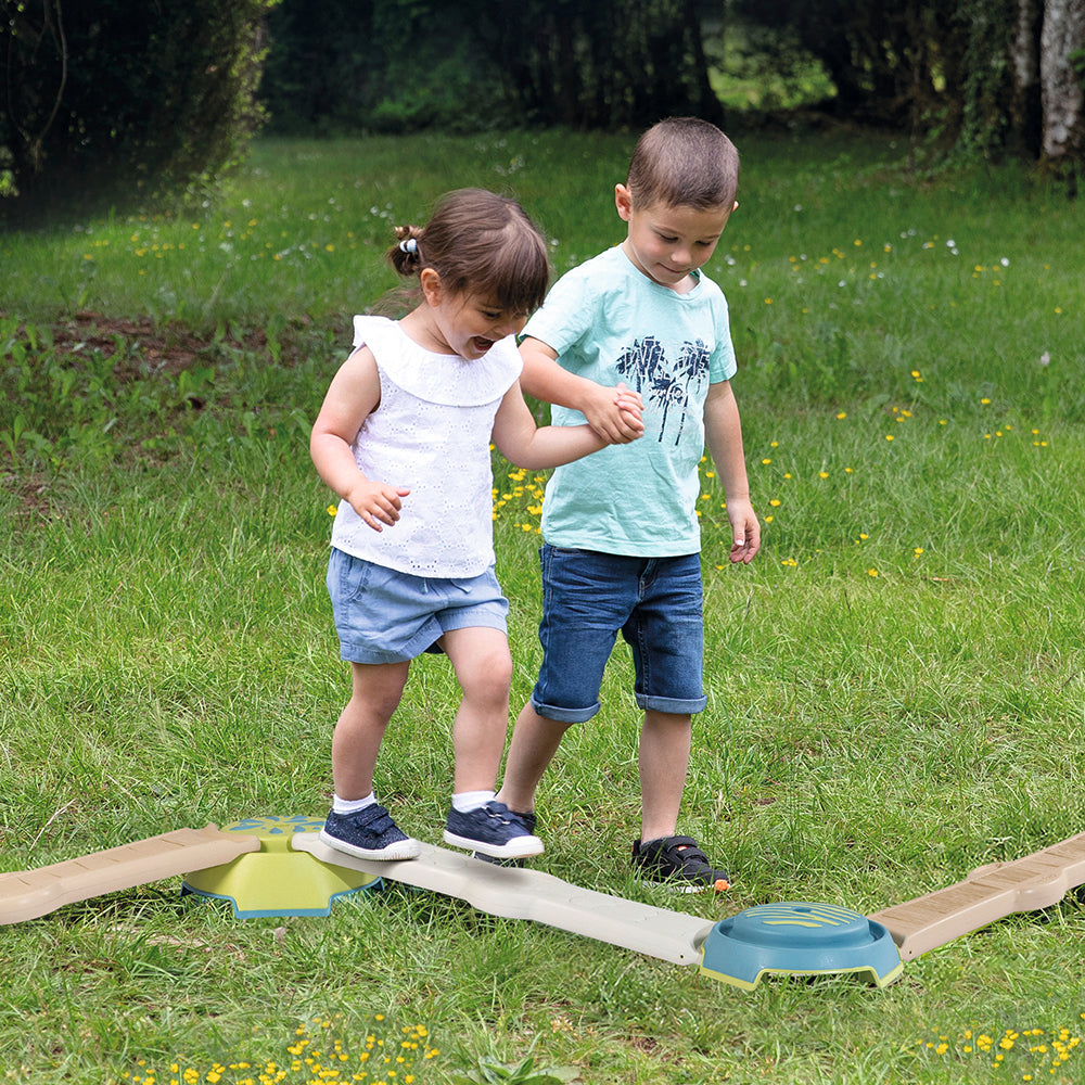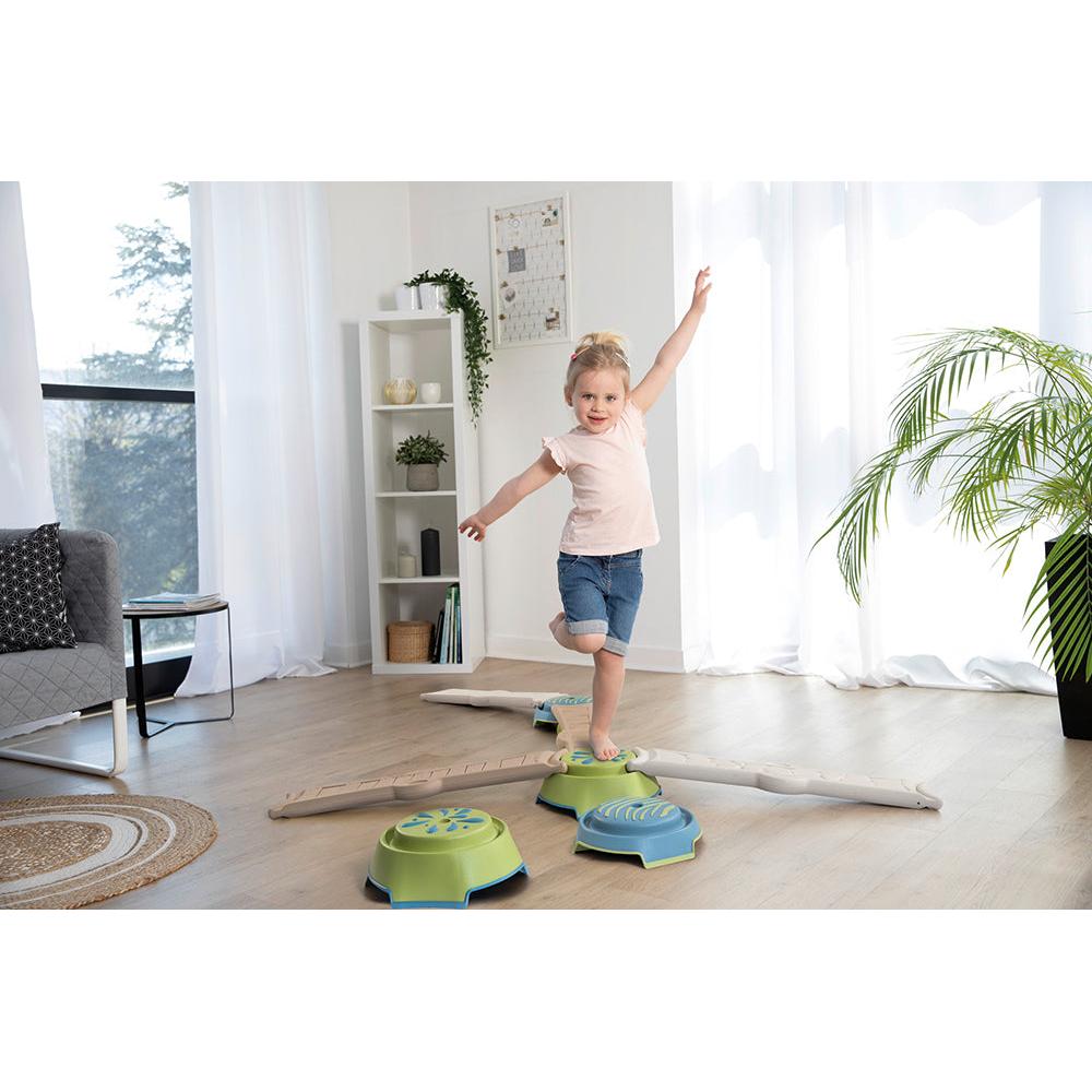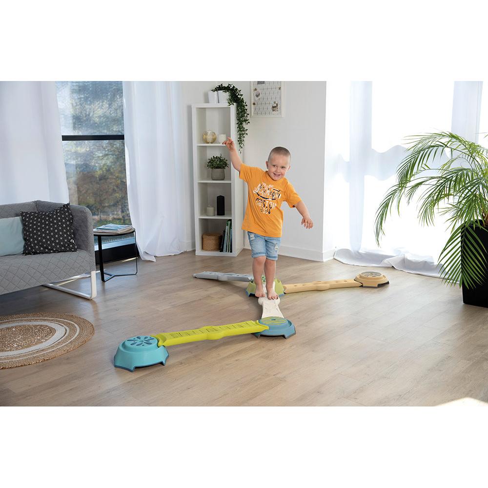 The course can be used both indoors and outdoors. It's UV and weather resistant. The boards, made of blown plastic, guarantee sturdiness and safety! As for the studs, they have a non-slip surface, so you can walk on them in complete safety. Once the game is over, you can easily store the elements in their transport box.