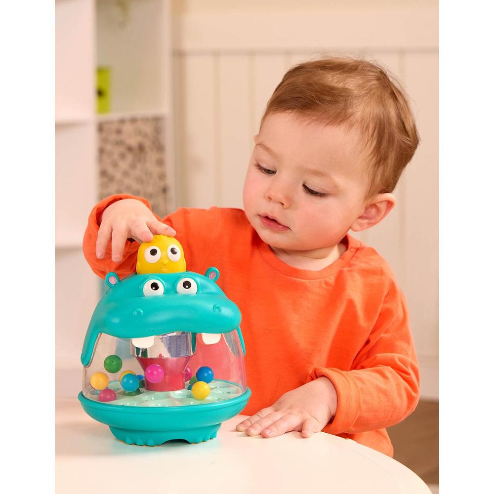 Break up playtime with the Party Pop Hippo from Battat! This classic children's toy is a real treat with its bright colors and thoughtful design. Simply press the yellow bird above the hippo's head to make the balls spin and jump, and watch the hippo's eyes move up and down!