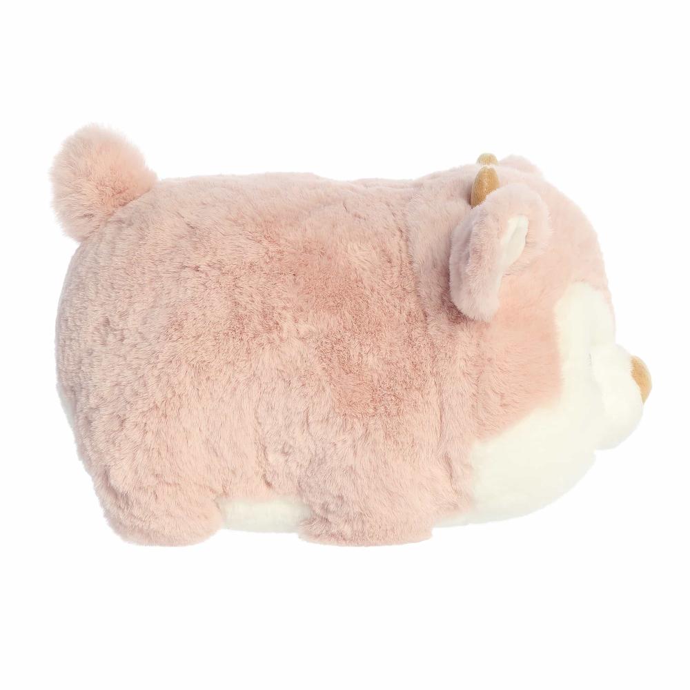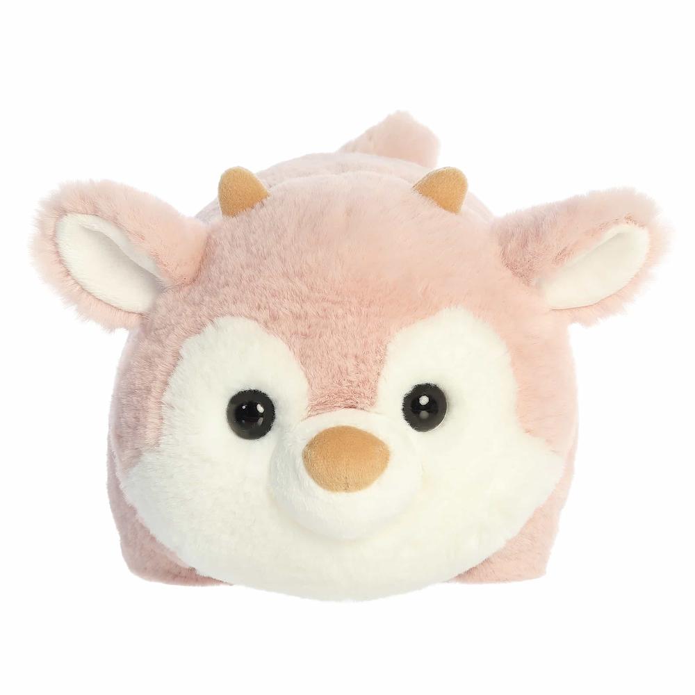 - Adorable pink reindeer plush is designed to resemble the shape of a potato.