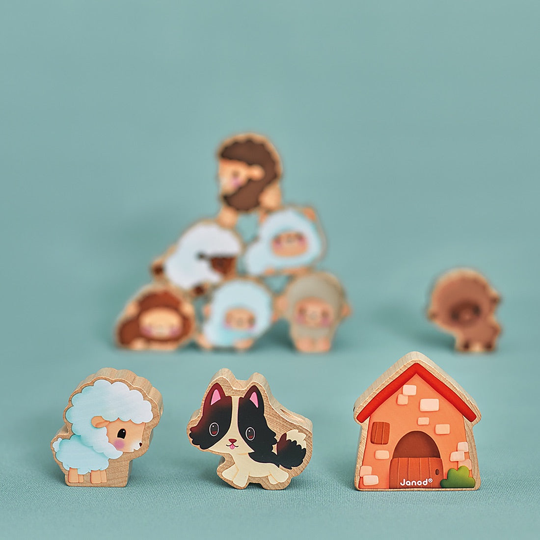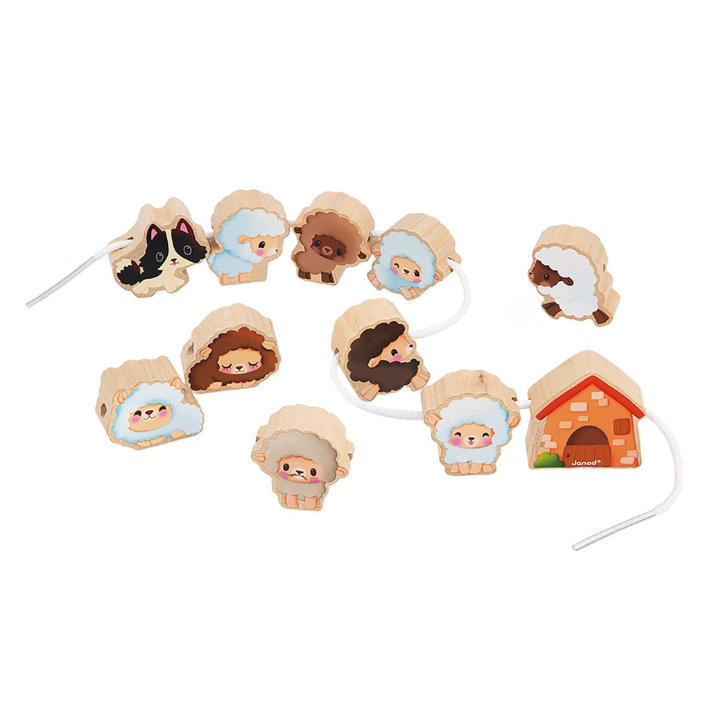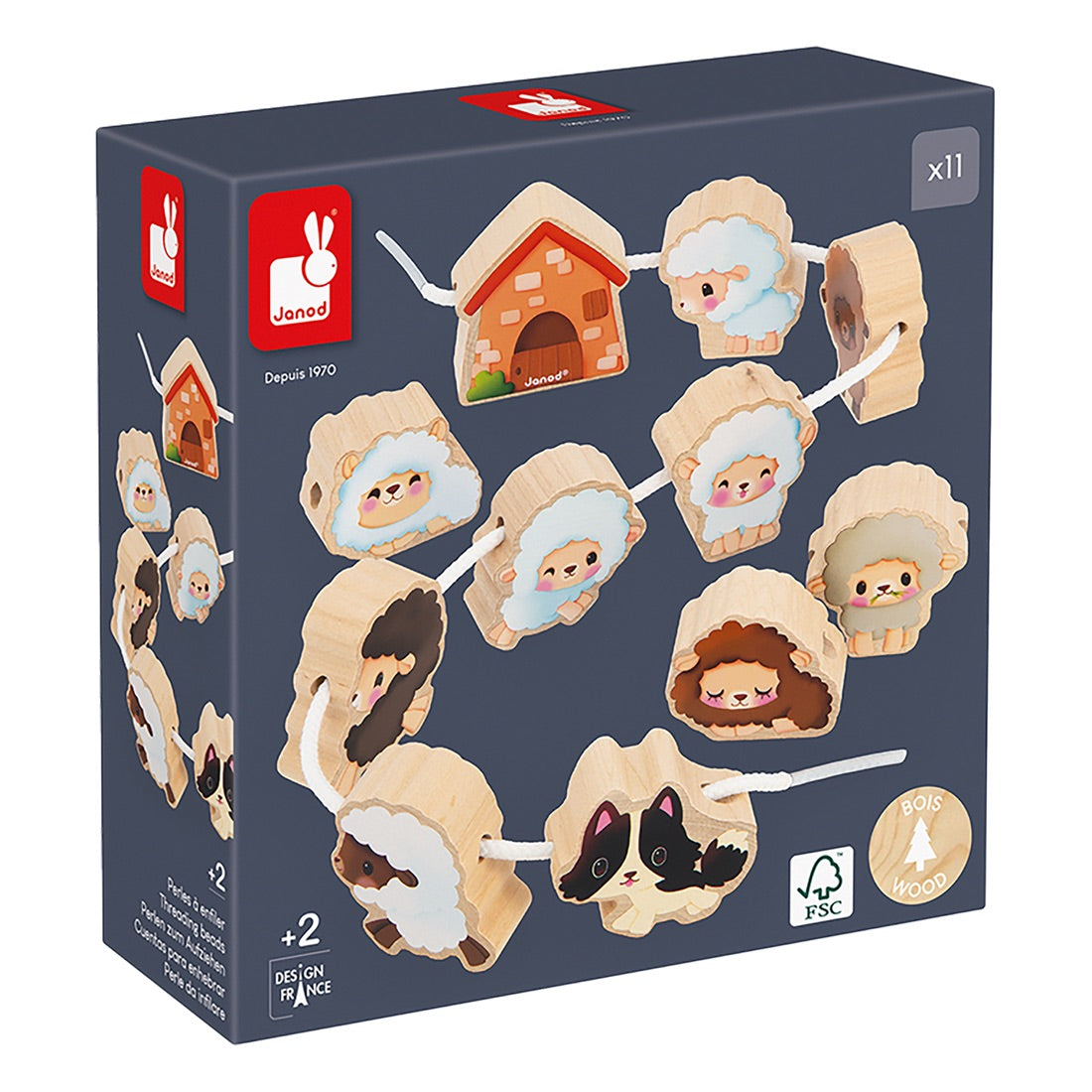 Our sheepdog friend needs help guiding the sheep to the sheepfold! This early-learning toy consists of 11 wooden pieces (9 sheep, 1 dog, 1 house) and 2 cords. Rigid end caps at the end of each cord facilitate the passage of beads, ideal for chubby little hands!