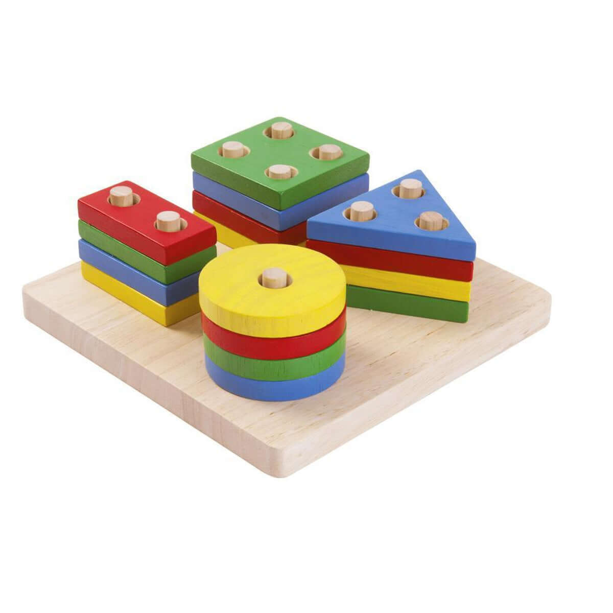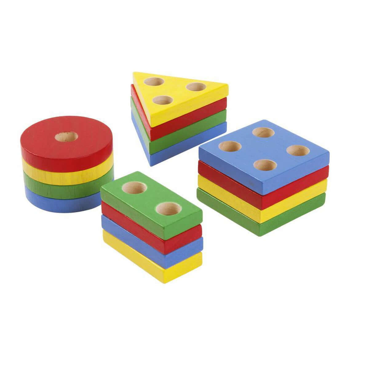 A set of 4 colorful geometric shapes can be stacked together based on the number of holes in the middle of each shape. A great Montessori toy!