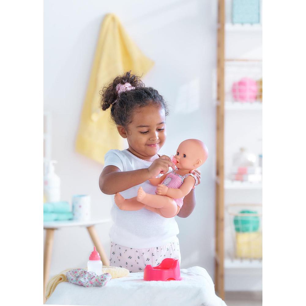 This large Corolle doll is anatomically correct and measures 36 cm. He drinks his bottle, goes to the potty "for real" when you press on his tummy (don't drip water all over the house!), and can be bathed. He is dressed in underwear and an undershirt.