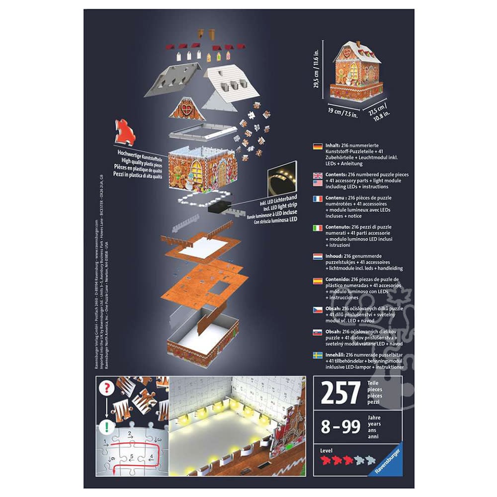- This 216-piece 3D puzzle comes with 41 additional accessories and a lighting module, including LEDs and instructions (3 AAA batteries required).