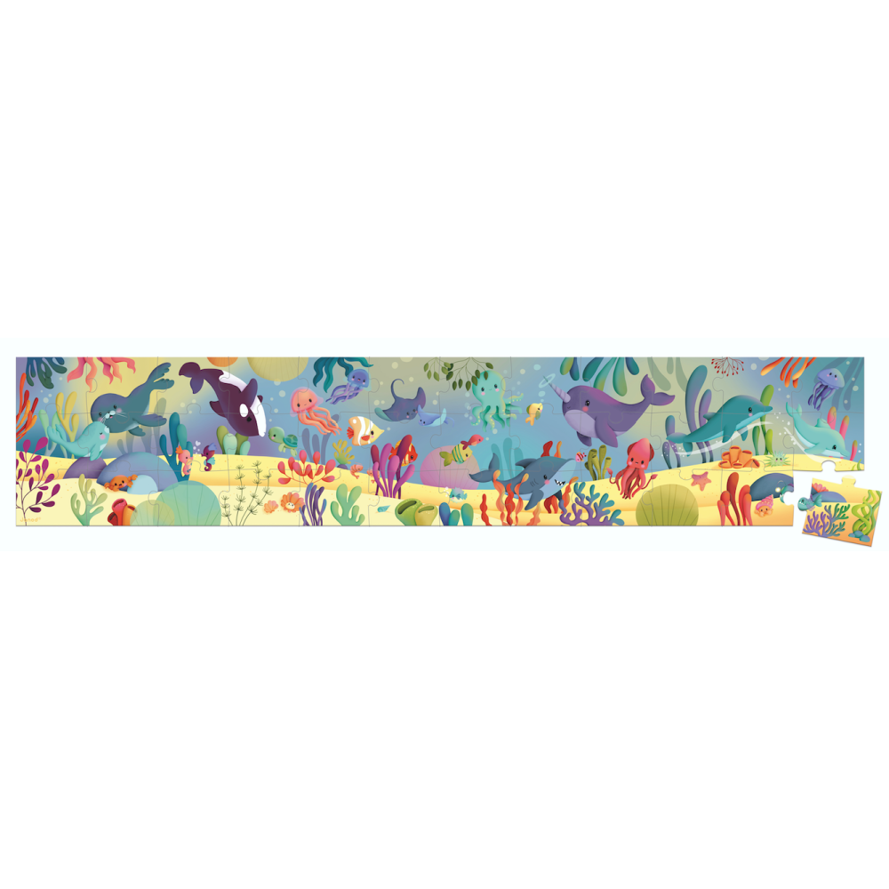 Discover the depths of the ocean! Dive in search of marine animals with this 36-piece illustrated frieze on the theme of sea creatures, suitable for children aged 4 and over.
