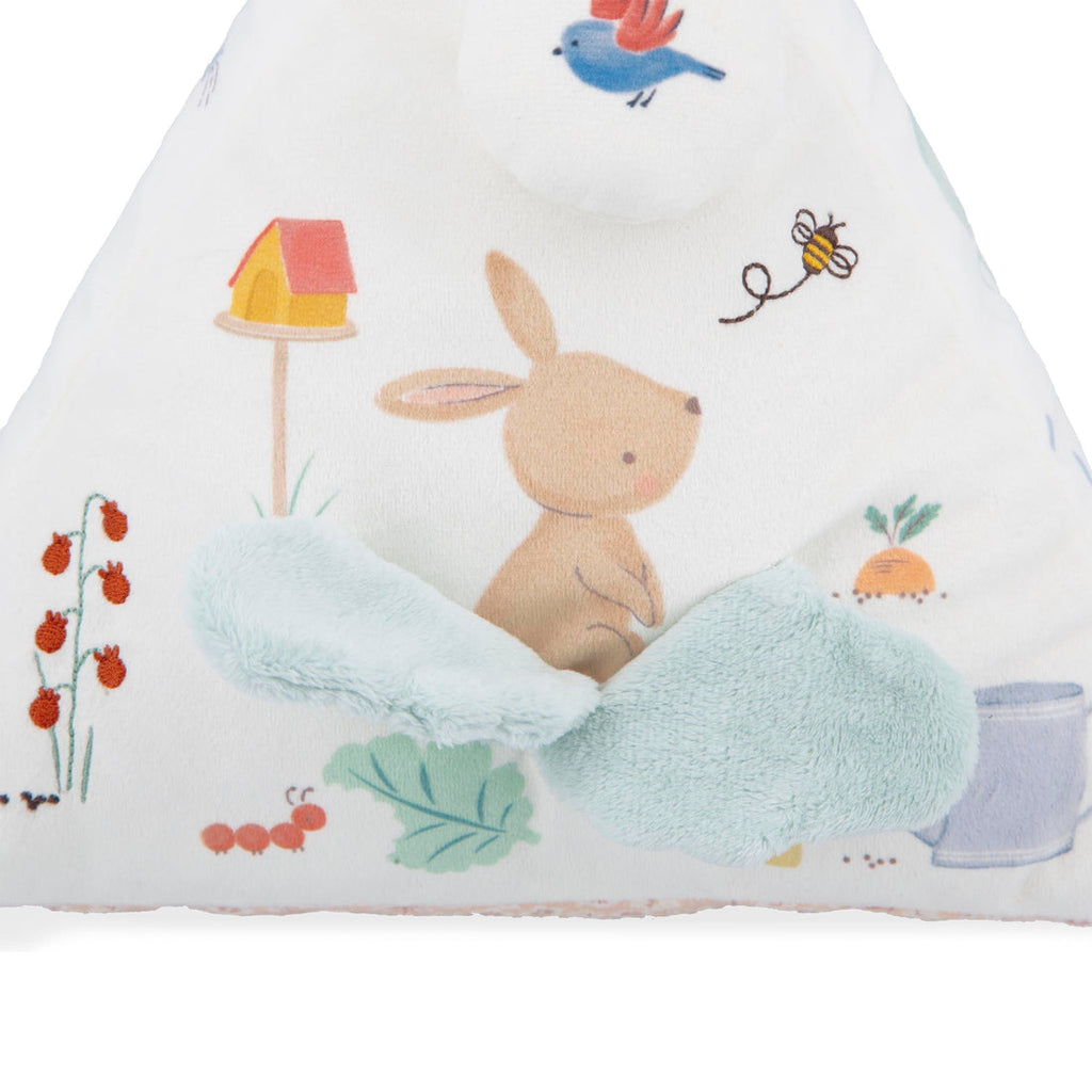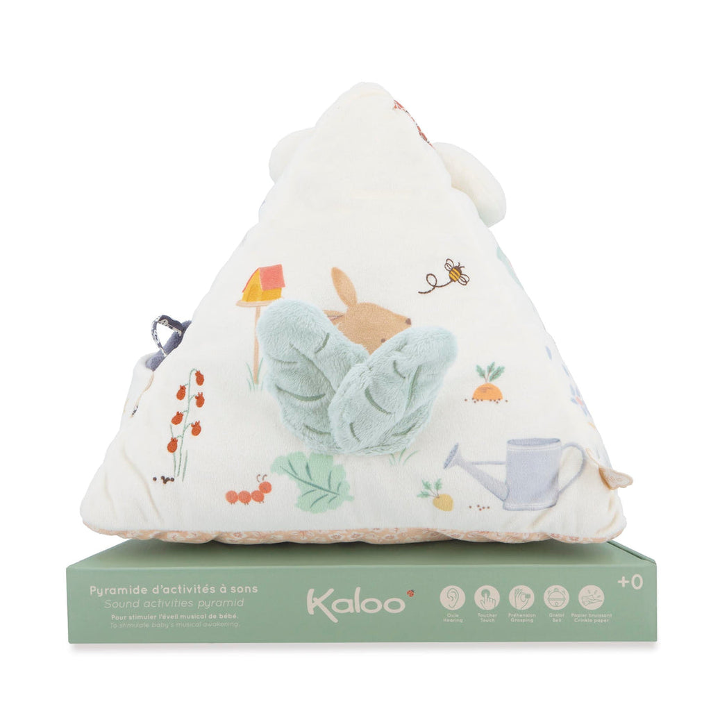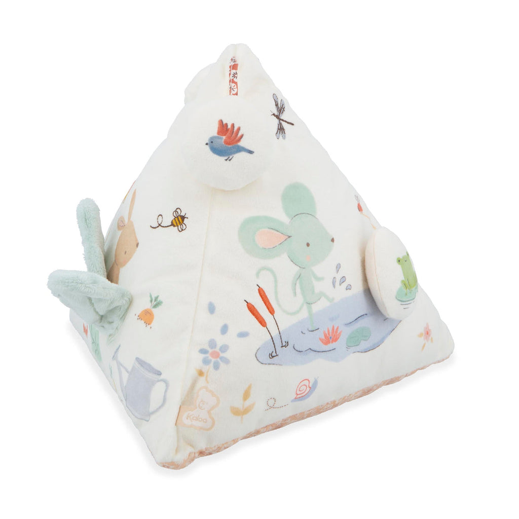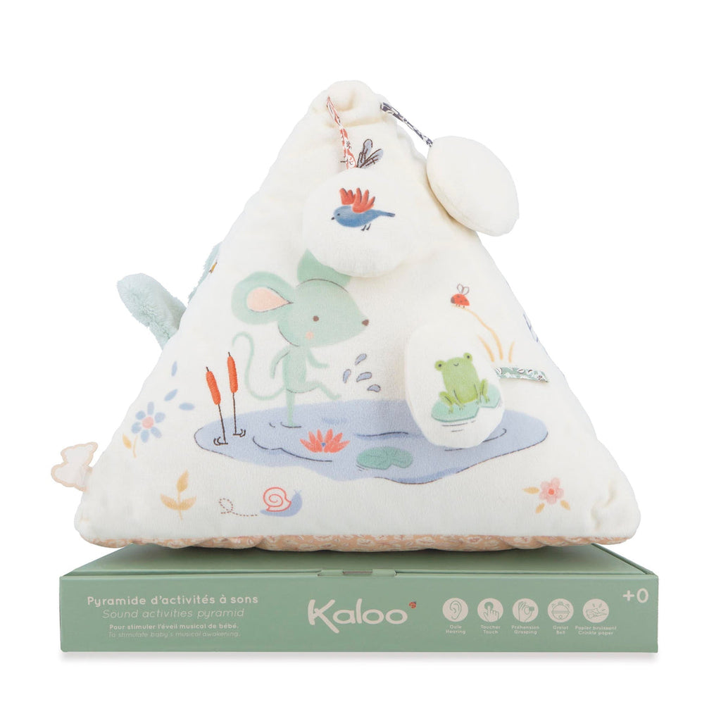 Ideal from birth, this activity triangle gently stimulates baby's hearing, sight and motor skills. To be placed in your little one's playpen or on his playmat for shared playtime, this fabric pyramid offers tender activities to discover on three sides. Rustling paper crackles, a bell tinkles merrily ...