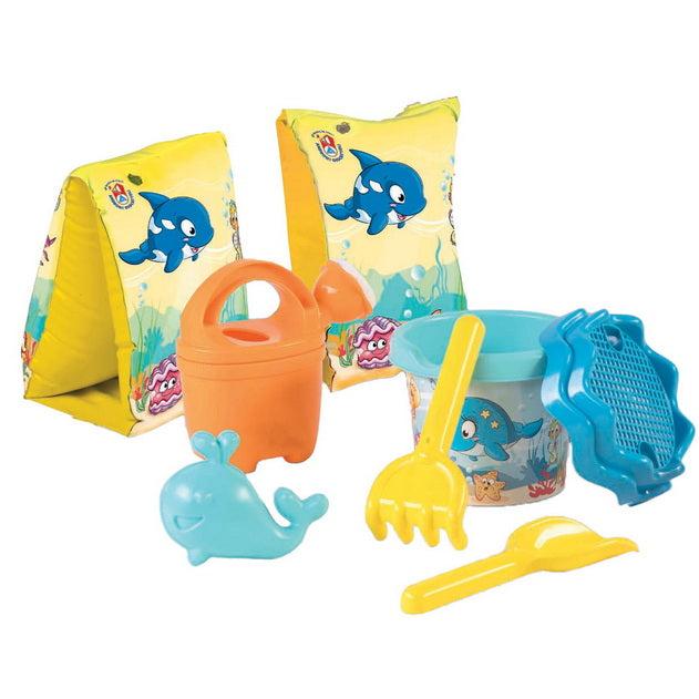 Get your child ready for hours of fun by the water with this colorful fish-themed beach set. It includes a practical backpack for easy transport of toys, plus a pair of safe arm floats for young swimmers.