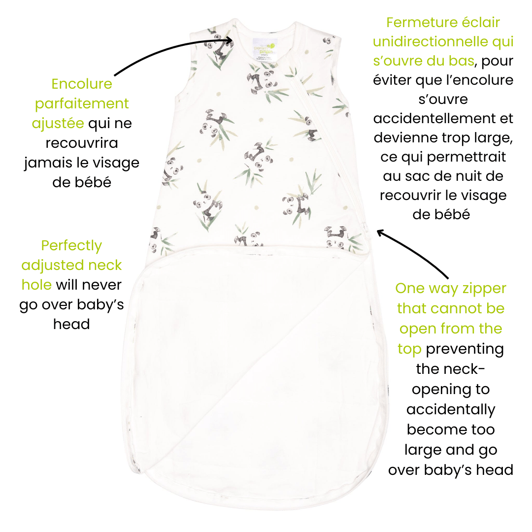 All Perlimpinpin sleep sacks are laboratory tested by independent firms to provide a safe and perfect solution for baby's sleep. The Perlimpinpin sleep sack fits snugly around the neck and opens all the way from the bottom to ensure that the sack never goes over baby's face. Canadian design.