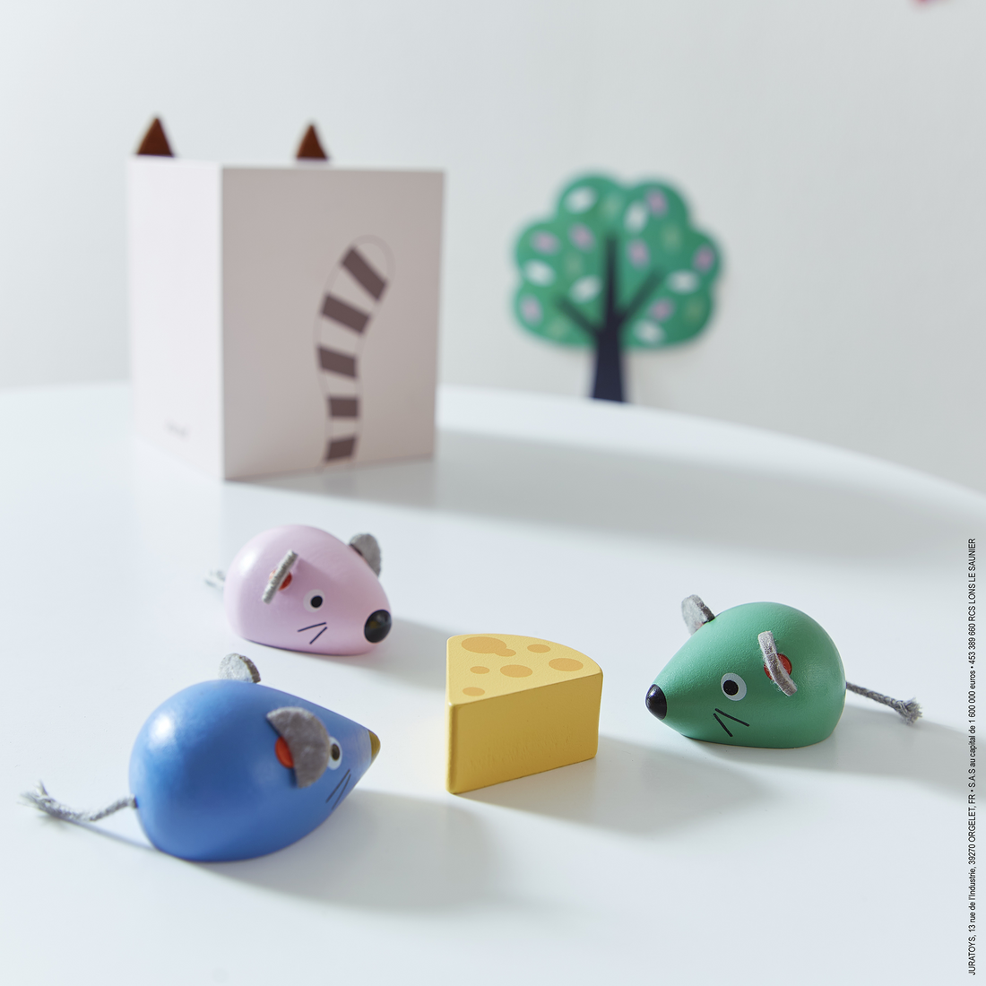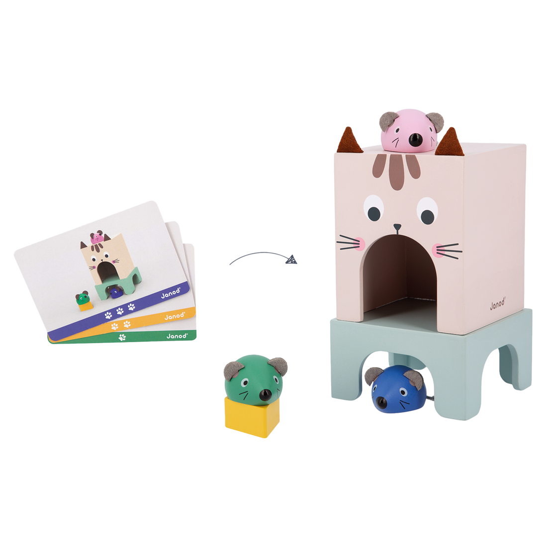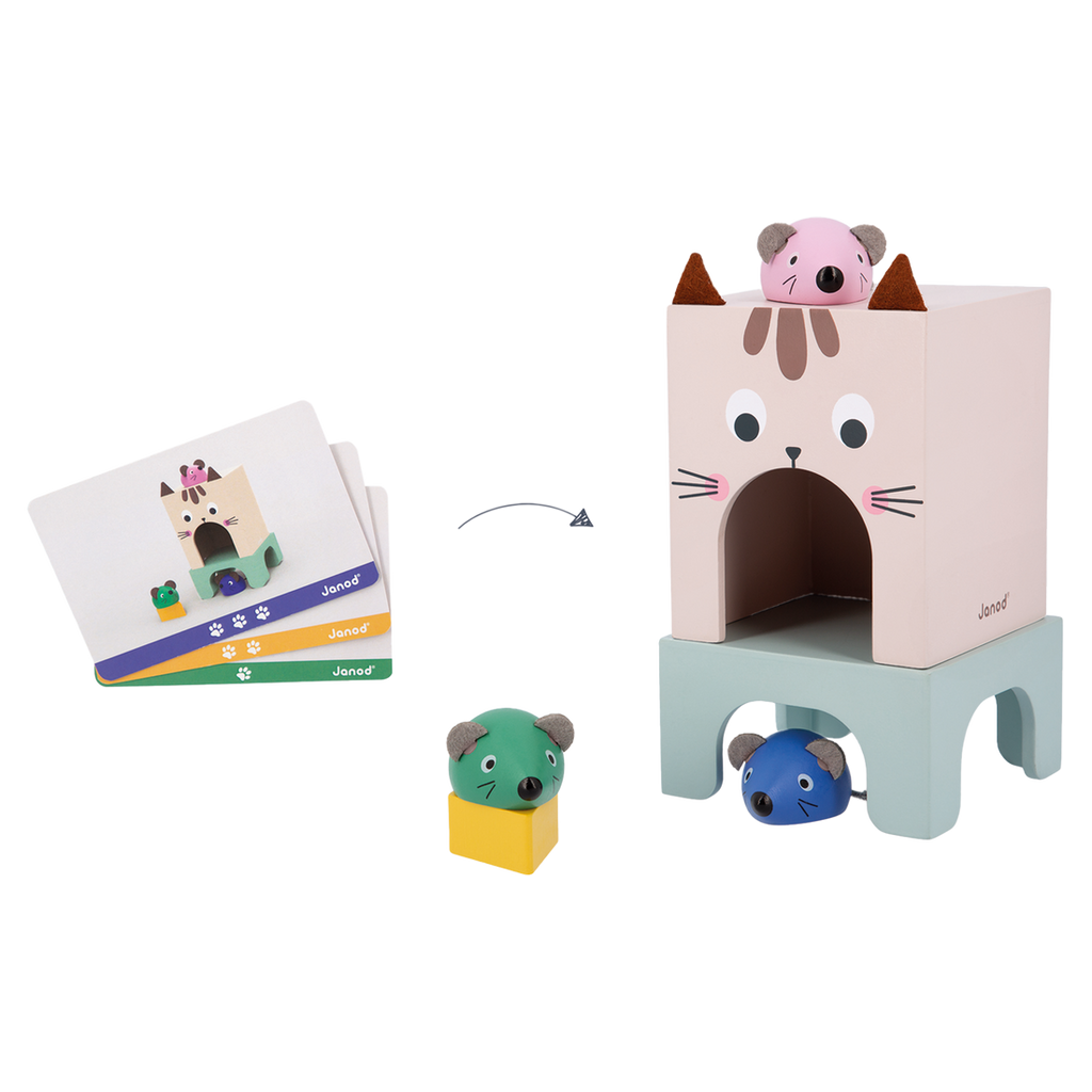 - Includes a cat, a table, 3 mice, a cheese and 24 model cards to reproduce.
