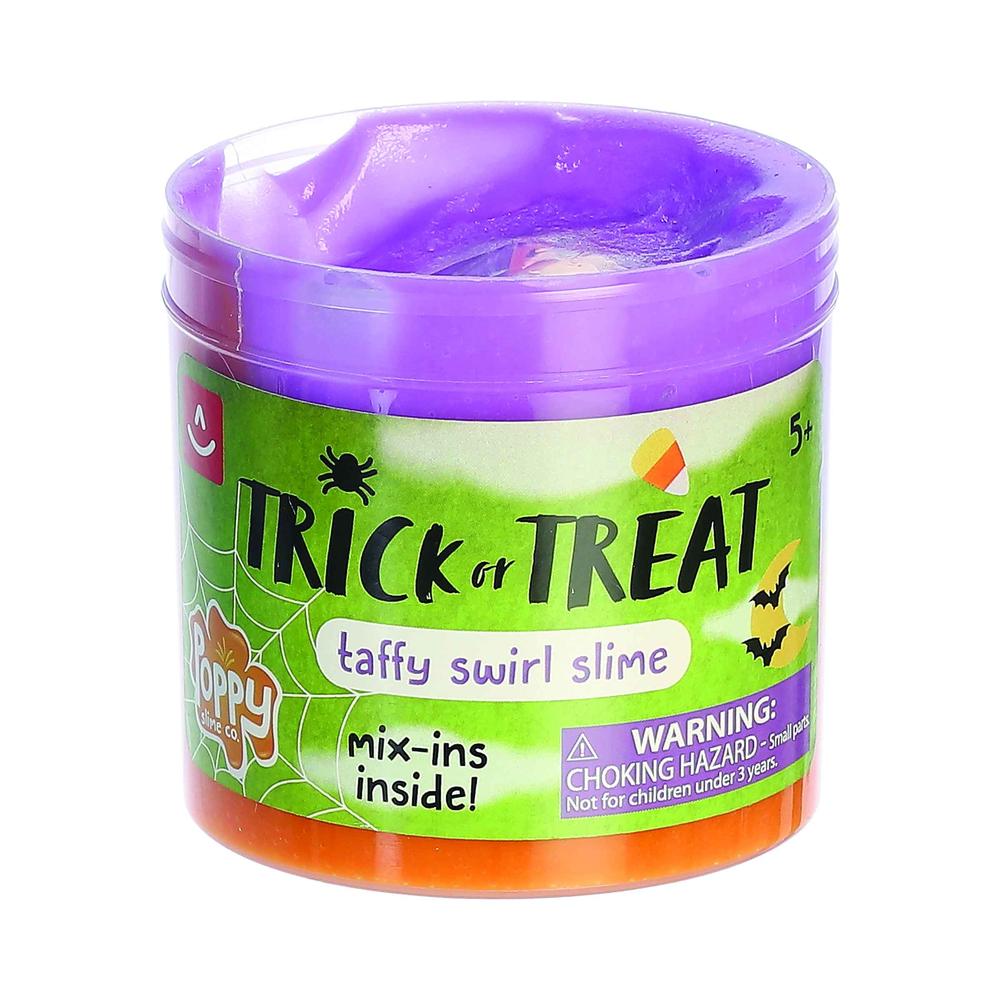Get into the spooky spirit of the season with Poppy Slime Co.'s "Trick or Treat" slime, from Aurora Toy's captivating slime range. This festive caramel-swirled slime is bursting with Halloween excitement, with vibrant orange and purple colors, and packed with fun mixes like bats, pumpkins and candy.