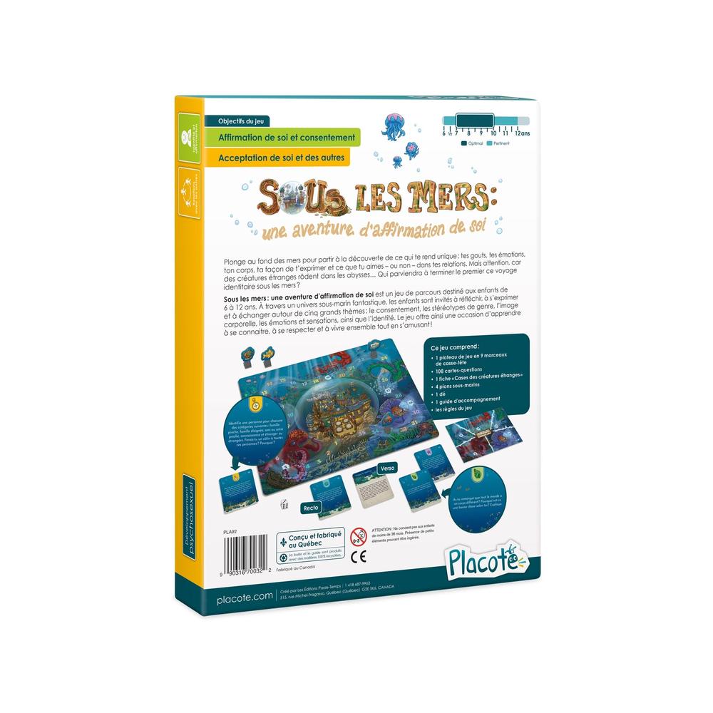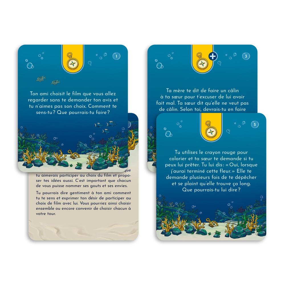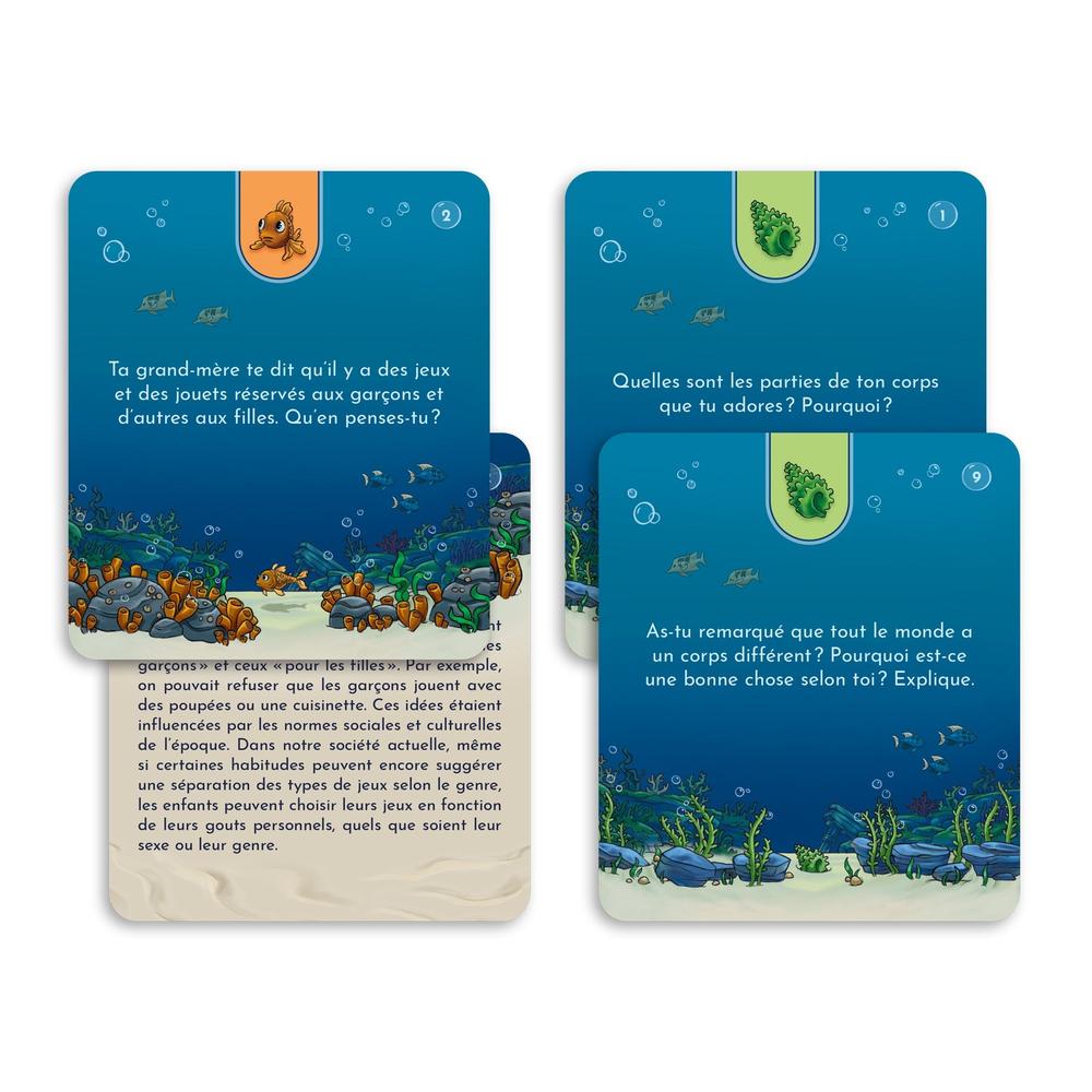 Sous les mers : une aventure d'affirmation de soi is a game designed for children aged 6 to 12. Through a fantastic underwater universe, children are invited to reflect, express themselves and discuss five major themes: consent, gender stereotypes, body image, emotions and sensations, and identity. The game is a fun way to learn about each other, respect each other and live together!